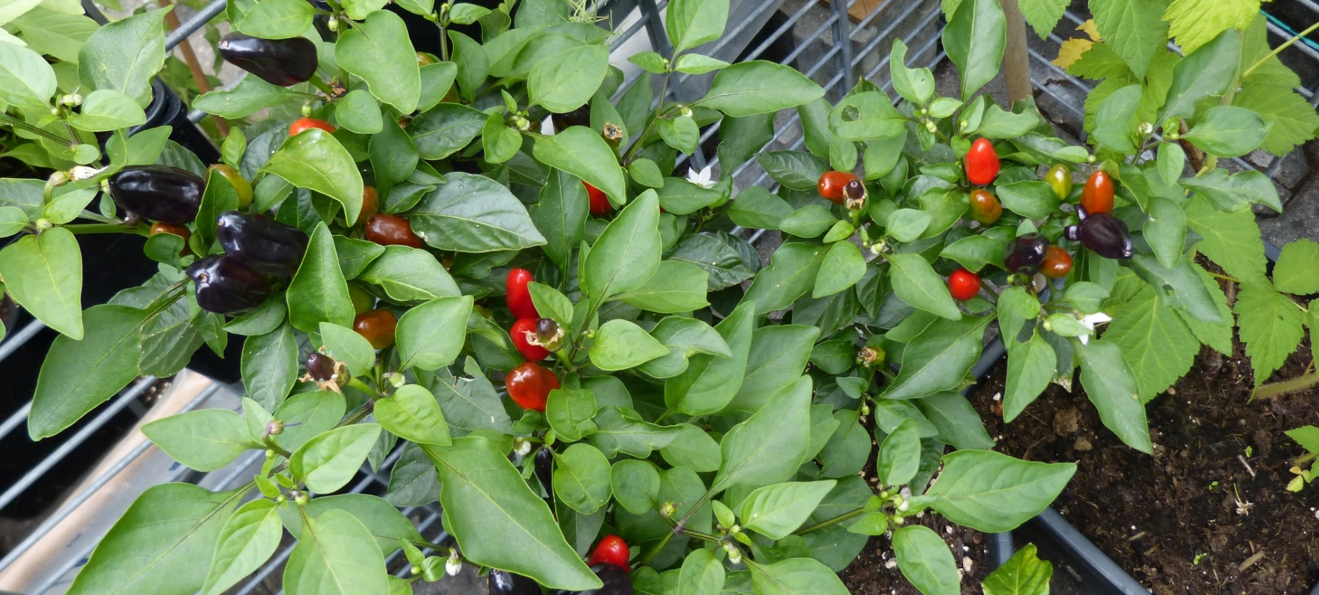 Die Paprika am Pflanzsteig kommen so langsam in die Gänge, die im Mai etwas erfrorenen, die dann doch noch aus Seitentrieben gekommen sind, sind jetzt teilweise von den Paradeisern überwuchert. Ich lasse die auch stehn, was anderes geht dort eh nicht hin. Kommt was, ist gut, wenn nicht, ist auch gut.