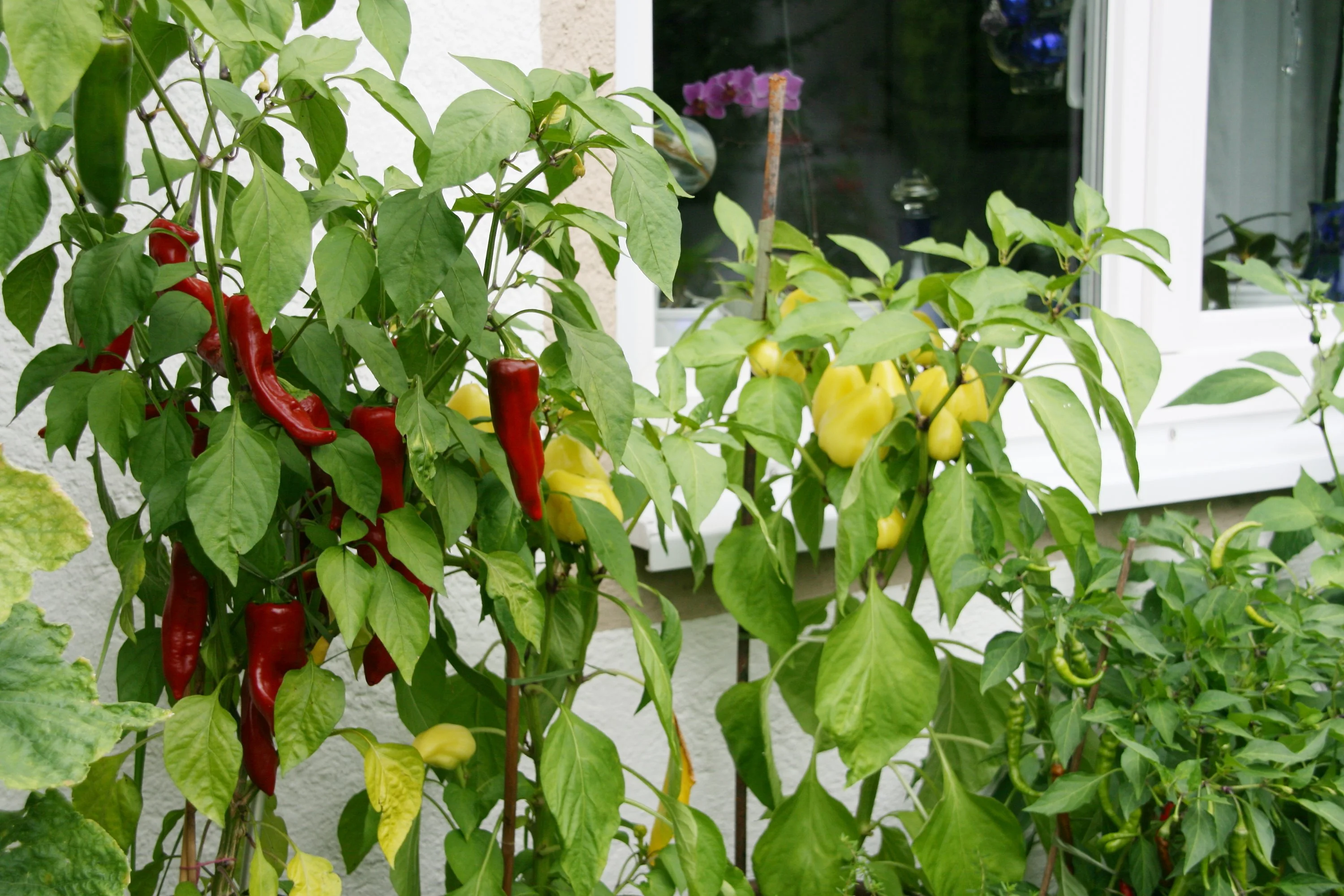 Den Paprika habe ich in Mörtelwannen gepflanzt und an die Hauswand gestellt. Da scheint ab mittag die Sonne hin und es ist an der Hauswand schön heiß. Das hat sich bewährt.