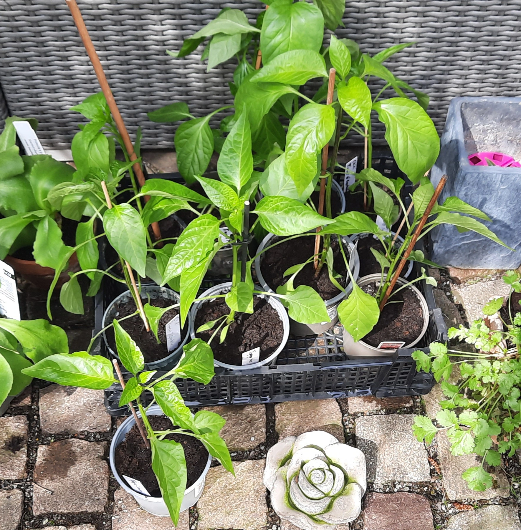 Paprikas und Chilis sind umgetopft und genießen jetzt ein schattiges Plätzchen auf der Terrasse.