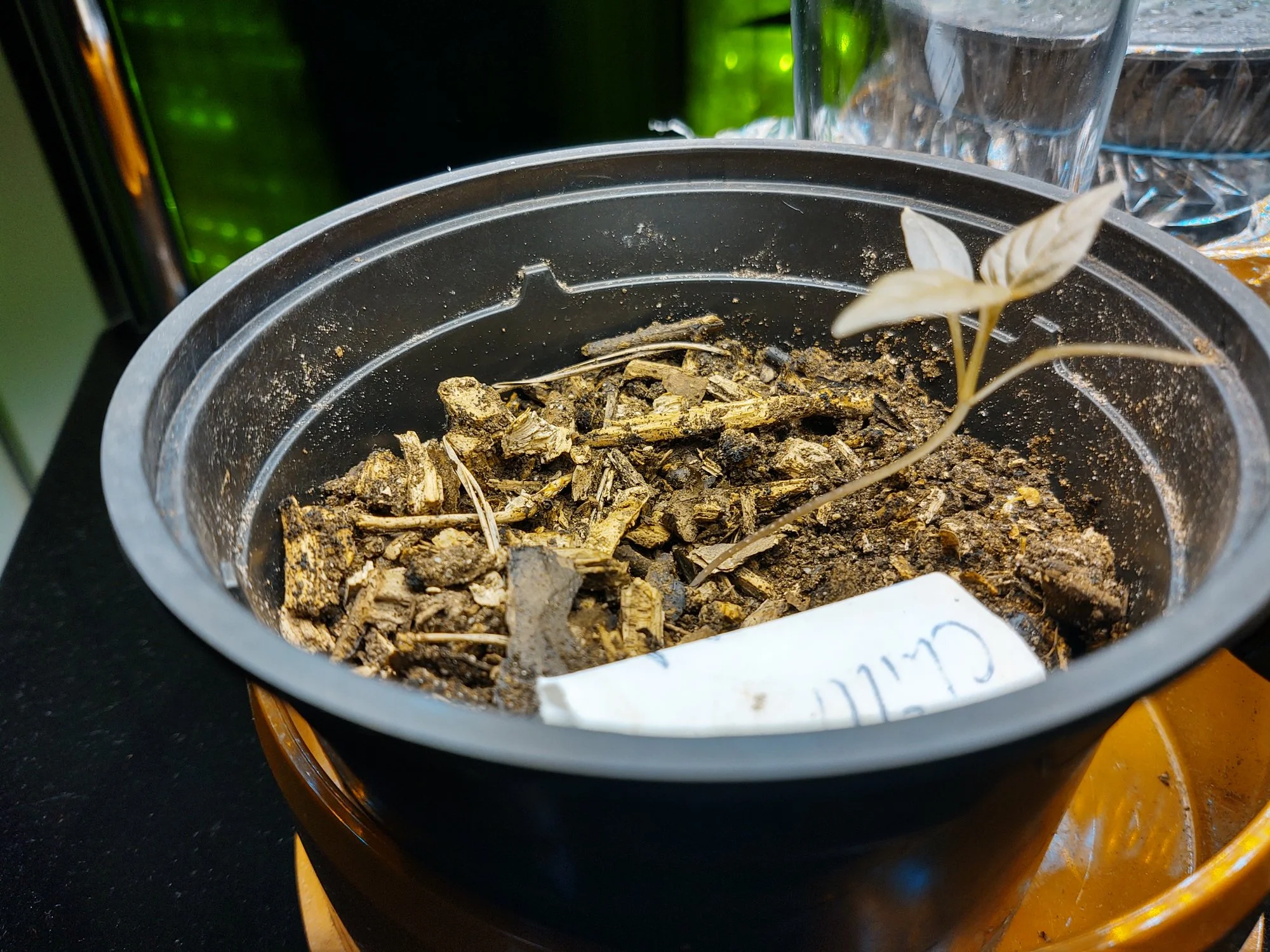 Aha, die kleine Paprika oder Chili wächst zum Licht, da würde ich rundherum etwas Erde auffüllen, sie dabei etwas aufrichten und dann für mehr Licht sorgen.