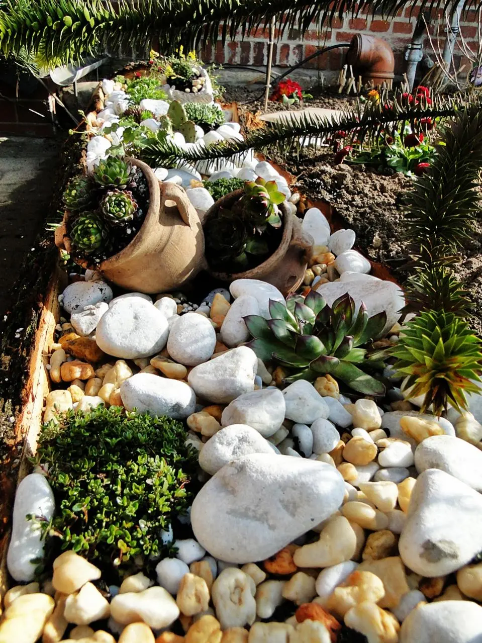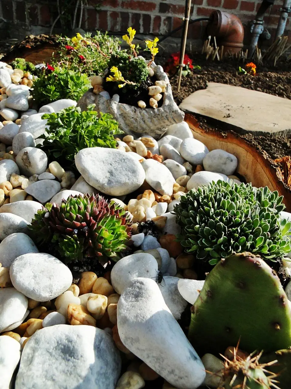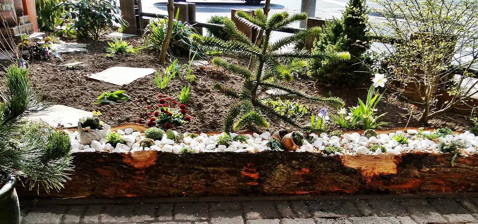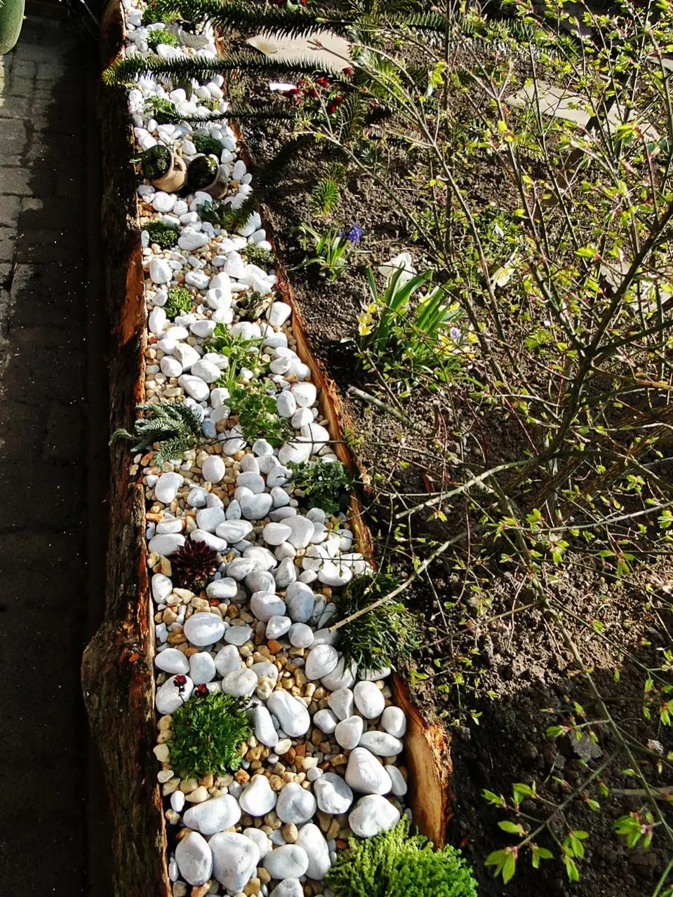 Der Stamm ist durchweg ausgehöhlt, man konnte quasi durchgucken. Dann wurde er mit einem Holzkeil (also seinem eigenen Innenleben) stabilisiert, aber so, dass kein Wasser drin stehen bleibt. Dann haben wir eine Schicht alte Steine, die nicht mehr so schön aussahen, rein gelegt, diese mit groben Kies verdichtet und dann kommt ne Schicht kleinere Steine und Erde. Zum Schluß die Steine die man auf den Fotos sehen kann.