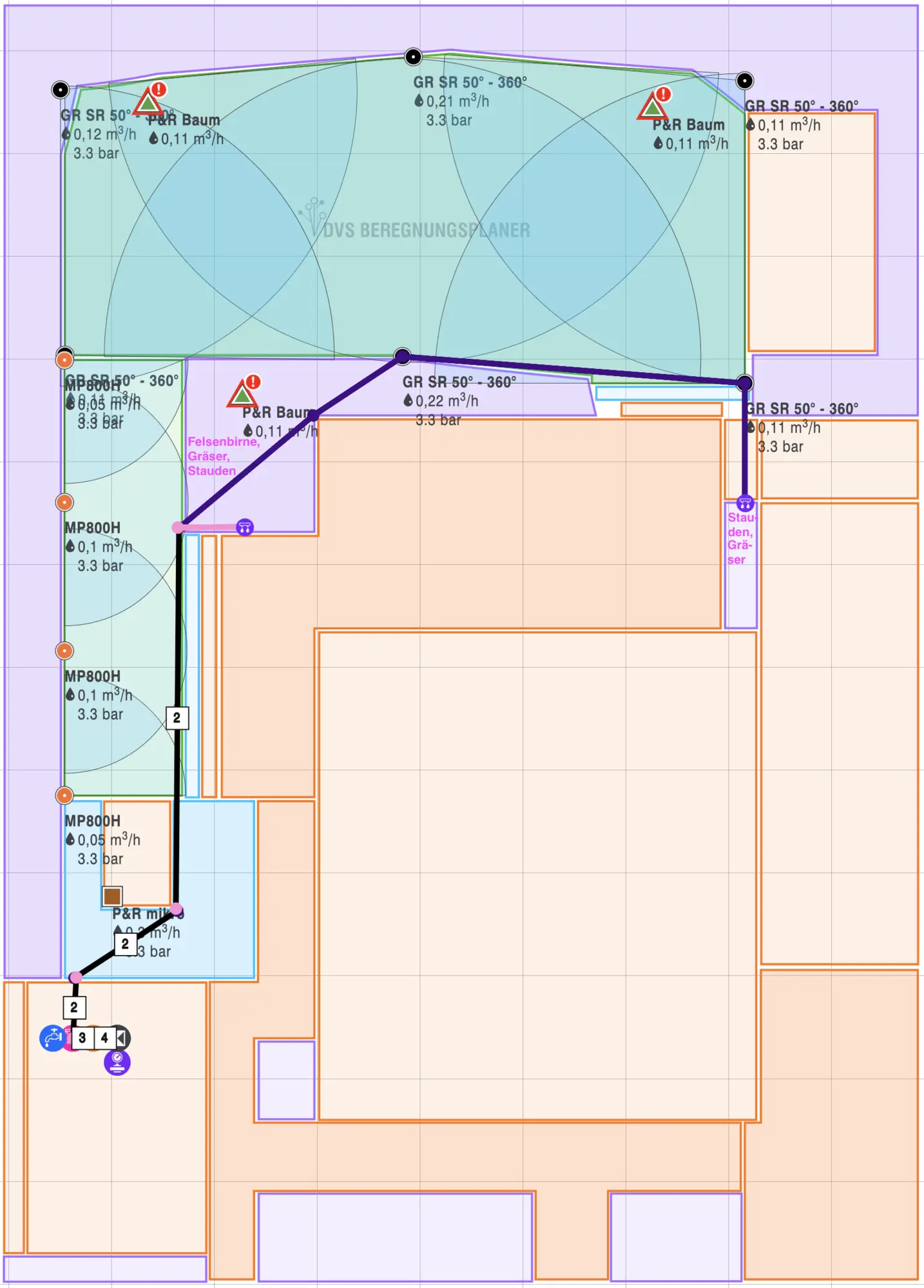 - Große Rasenfläche vermutlich mit PE32 / 1", bei den anderen reicht vielleicht PE25 / 3/4" (sofern man das kombinieren kann?