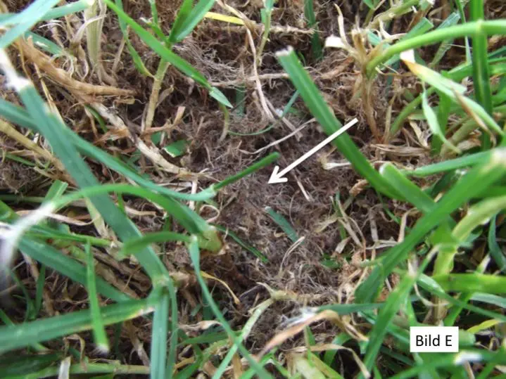 Übrigens zeigt Bild E eine Rupfstelle: dort ist ein starker "Wurzelfilz" zu sehen. Hierbei kann ich mit nicht vorstellen, dass eine darauf gebettete Nachsaat zum Keimen kommt - sondern sie wird m.E. vertrocknen.