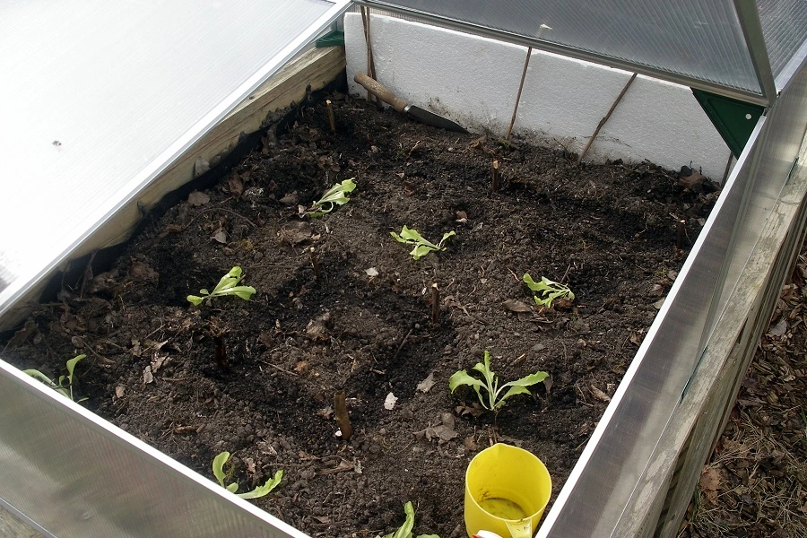 Solange das Gewächshaus noch nicht steht, kommen Salat und Radieschen ins Hochbeet unter den Frühbeetkasten: