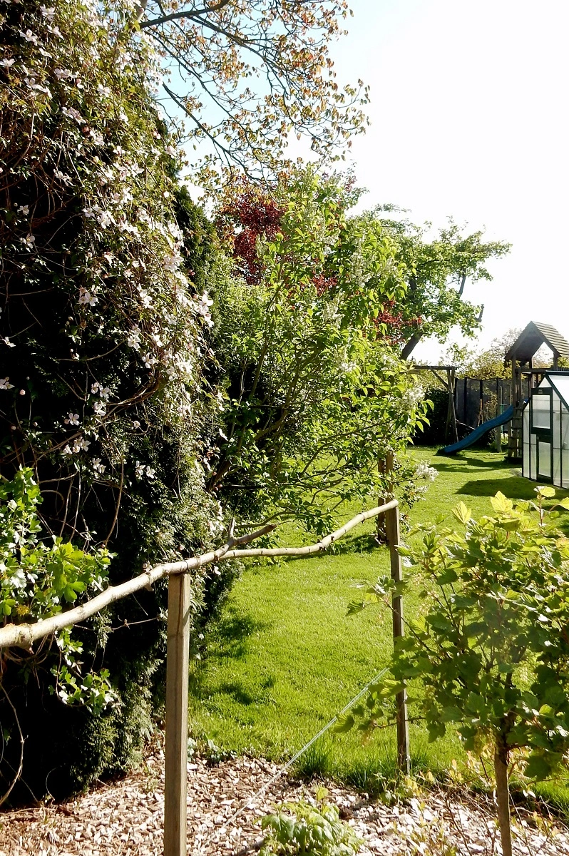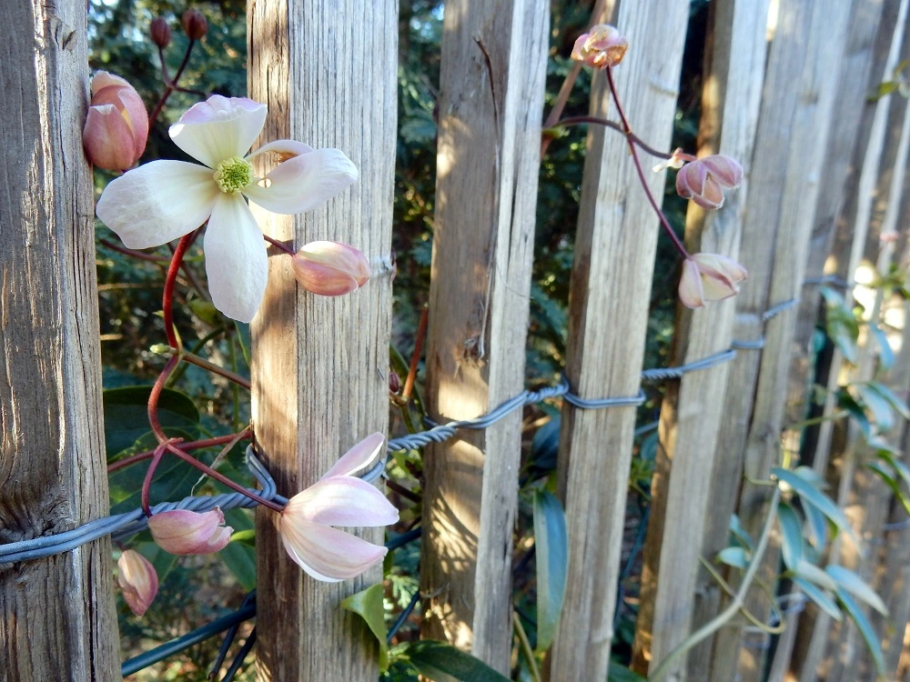 • Die immergrüne Clematis armandii Apple Blossom blüht seit einigen Tagen: