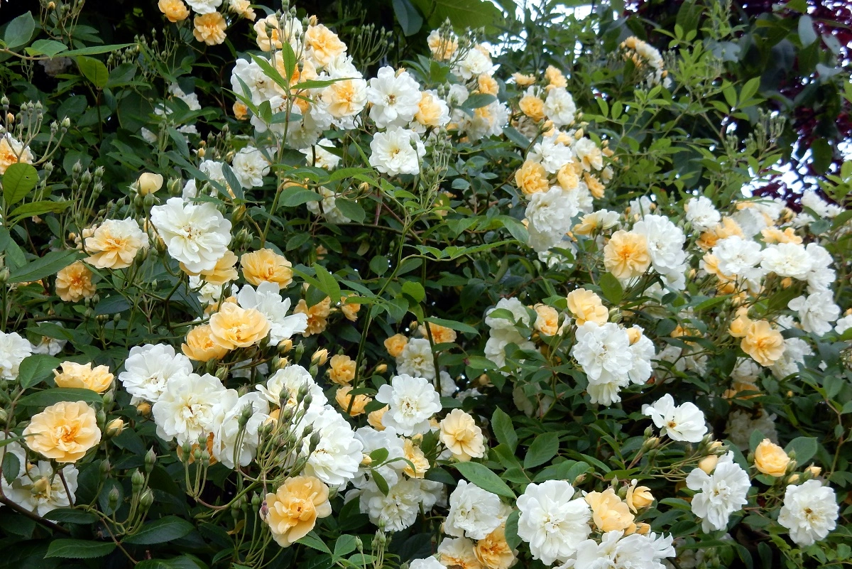 Und Christine Hélène hat so lustig gemischtfarbige Blüten. Außerdem duftet sie stärker und hat im Herbst kleine Hagebutten.