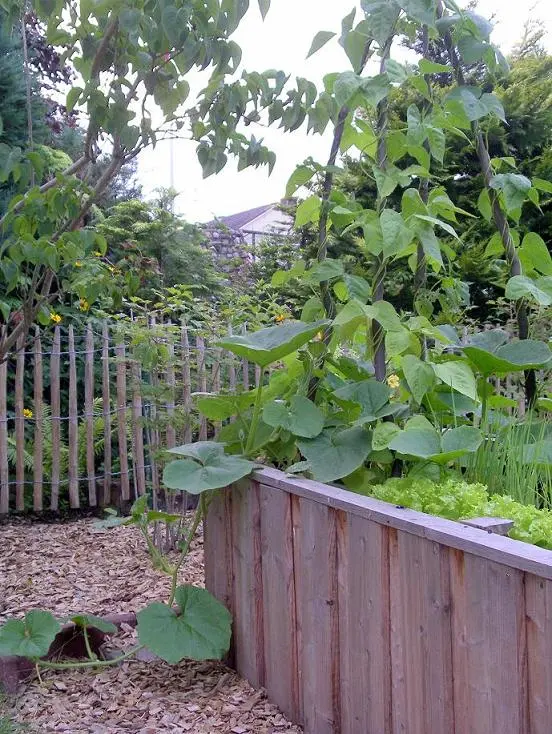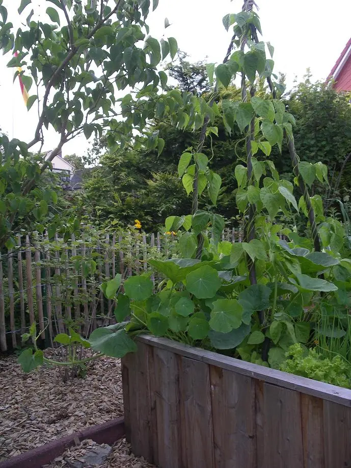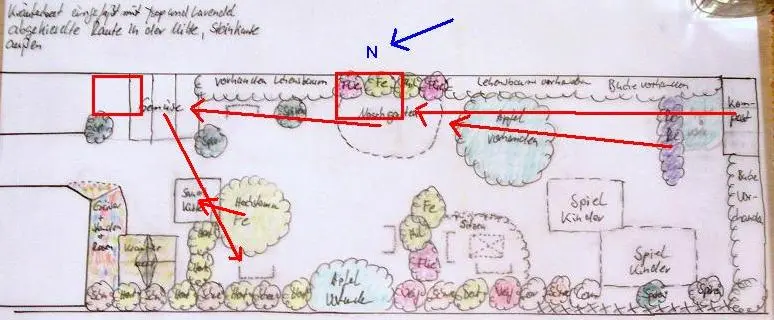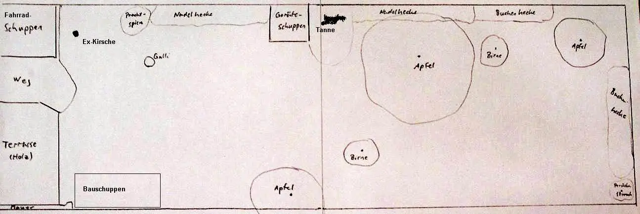 Dann würde ich parallel zur jetzt schon vorhandenen Hecke an der Südgrenze eine neue Hecke pflanzen, z.B. Glanzmispel, die ist sehr schön und wirft auch im Winter ihr Laub nicht ab, die allerdings nicht kerzengerade von Osten nach Westen mit Durchgang (vergleichbar einer Zimmerwand mit Tür), sondern versetzt gepflanzt wird. Ob nun der östliche Teil der Mispelhecke oder der westliche Teil mehr nach Süden geht, hängt auch vom genauen Standort der Apfelbäume ab. Beide Teile könnten sich überlappen, das finden vielleicht auch deine Kinder ganz witzig.