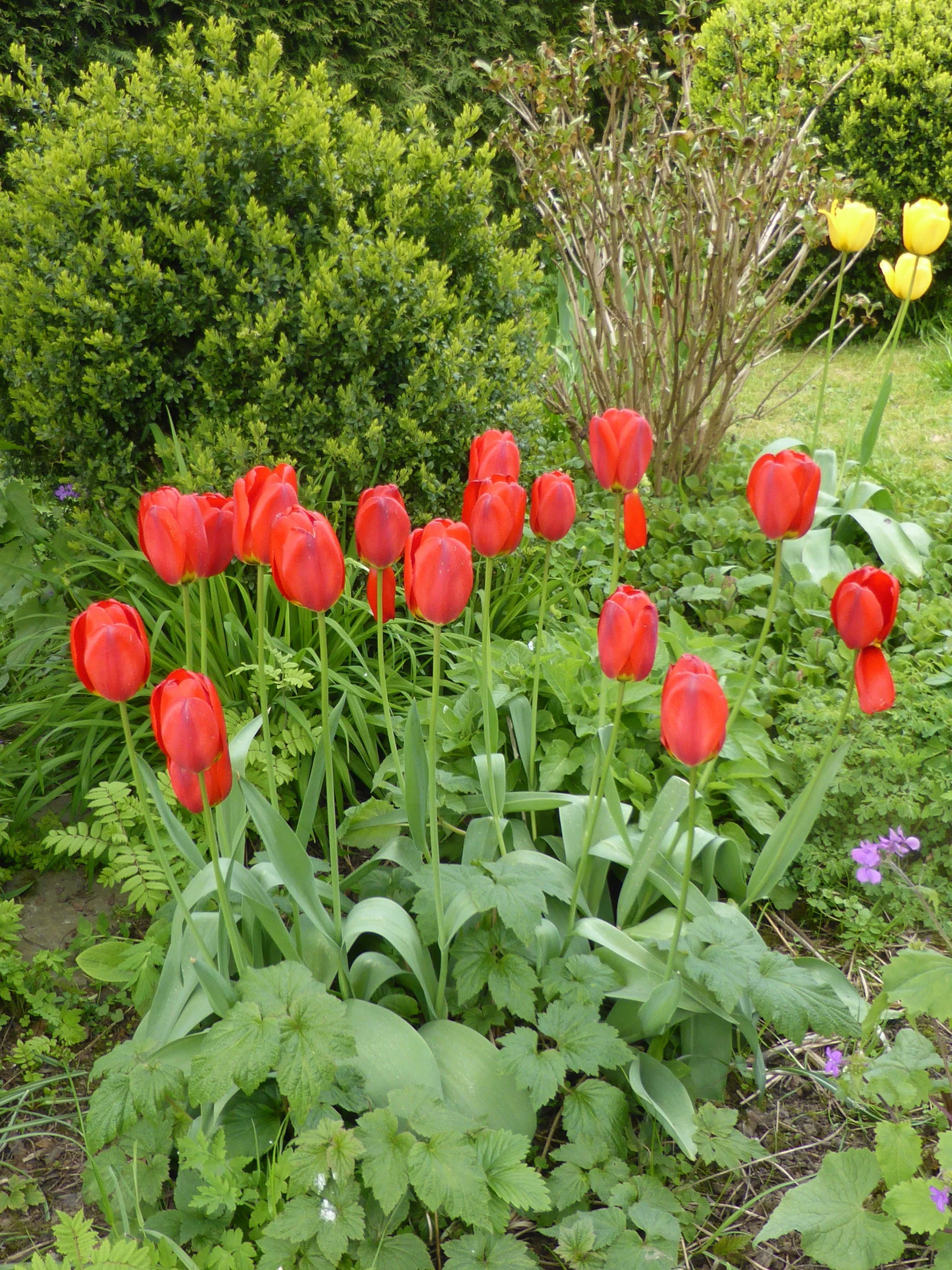 Die erste Akelei, Mondviole und Tulpen: