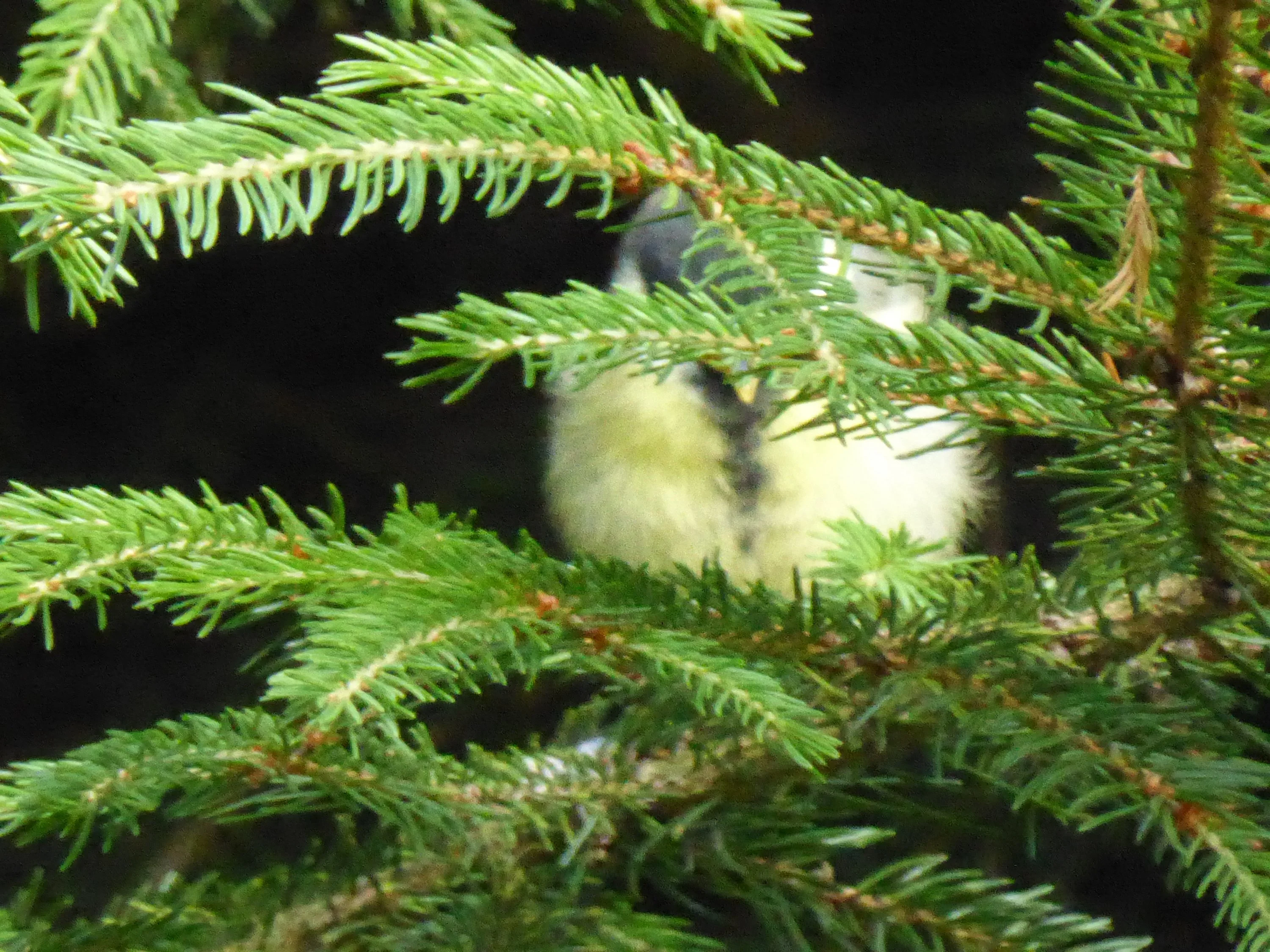 In den Fichten vom Nachbarn war großes Palaver. Wir störten und haben uns dann auch vorsichtig zurückgezogen. Immerhin wollte ein Meisenpaar seinen Jungvogel füttern, der die ganze Zeit "Hunger!" schrie. (Deshalb gibt es vom Jungvogel auch nur dieses Foto hinterm Zweig, ich wollte da nicht länger stören.)