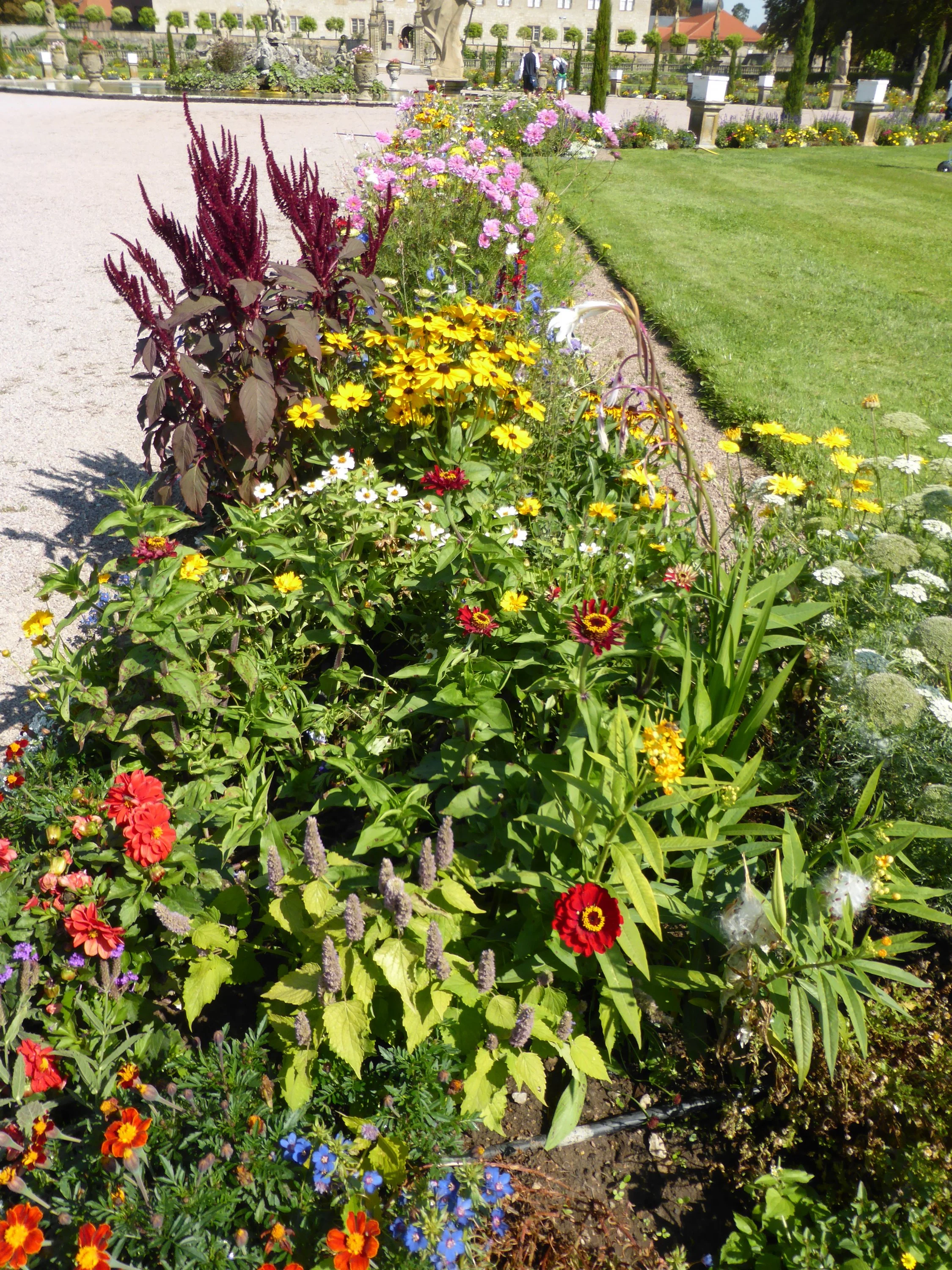 Deshalb haben wir auch in Weikersheim eine lange Pause gemacht, das Schloss angesehen und besonders auch den Schlosspark und natürlich auch auf dem Marktplatz Eis gegessen. Im barocken Schlosspark blühte es über und über und es waren auch viele große, blaue Holzbienen unterwegs - leider zu schnell für mich.
