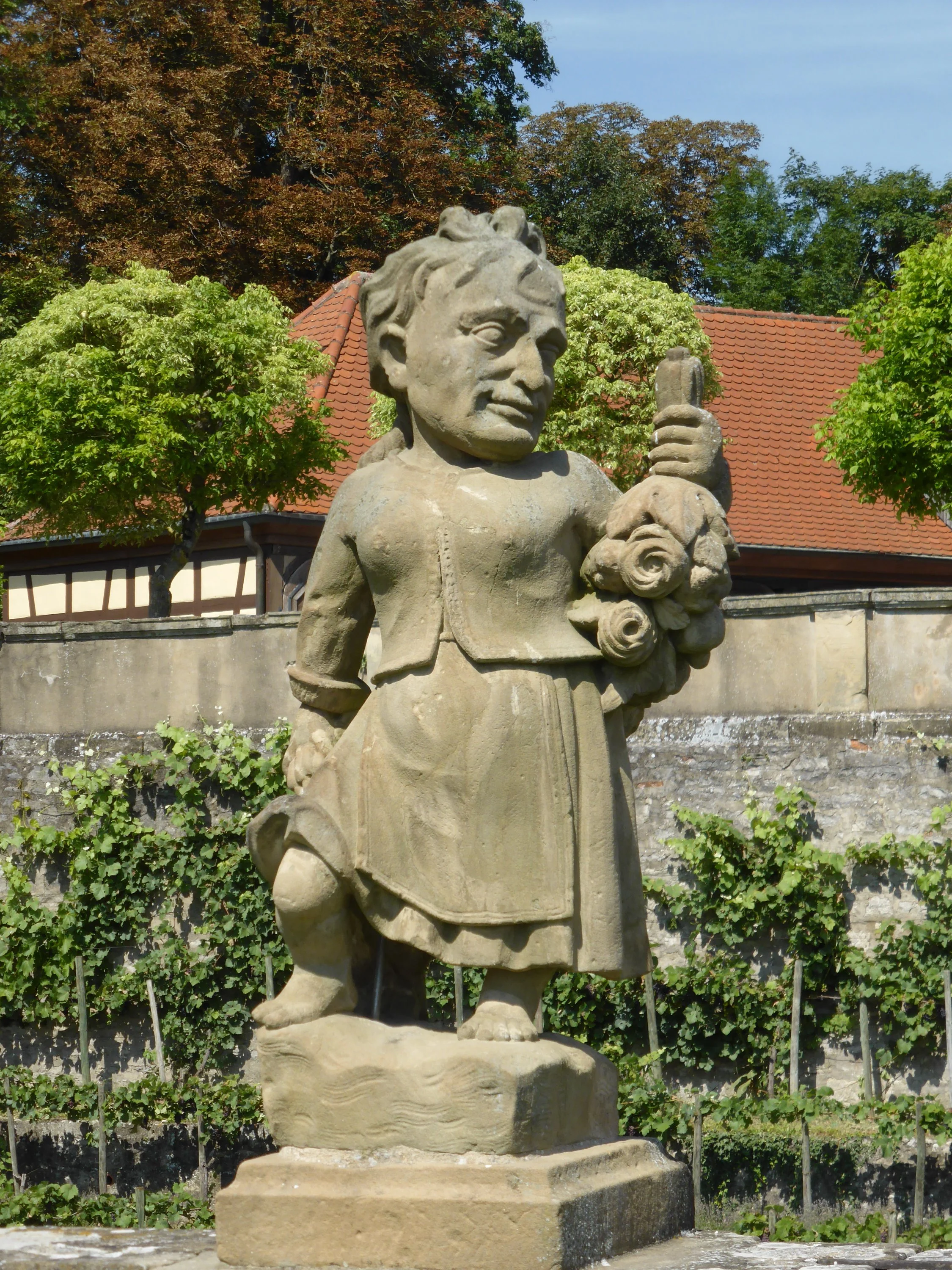 Die Tauber ist eine unheimlich fruchtbare Gegend. Man fährt viel mit Sicht auf Weinberge und Streuobstwiesen. Und in den Orten haben die Leute richtige Bauerngärten, jetzt überquellend vor Dalien und Sonnenblumen und ganz viel Gemüse. (Wer bei dem Klima keine Tomaten und Kürbisse pflanzt, ist aber auch selber schuld.) Was wir kaum gesehen haben, das waren sterile Einheitsgrün-Gärten oder mit Tuja/Kirschlorbeer oder ähnlichem abgeschirmte Gärten. Mir hat es gefallen, dass alles so offen war und sich die Leute sichtlich nicht dran störten, ob sich außer ihnen selbst noch ein vorbeikommender Radfahrer an ihren Blumen freute. Stehen geblieben und fotografiert habe ich dann aber nicht, das wäre mir zu aufdringlich vorgekommen.