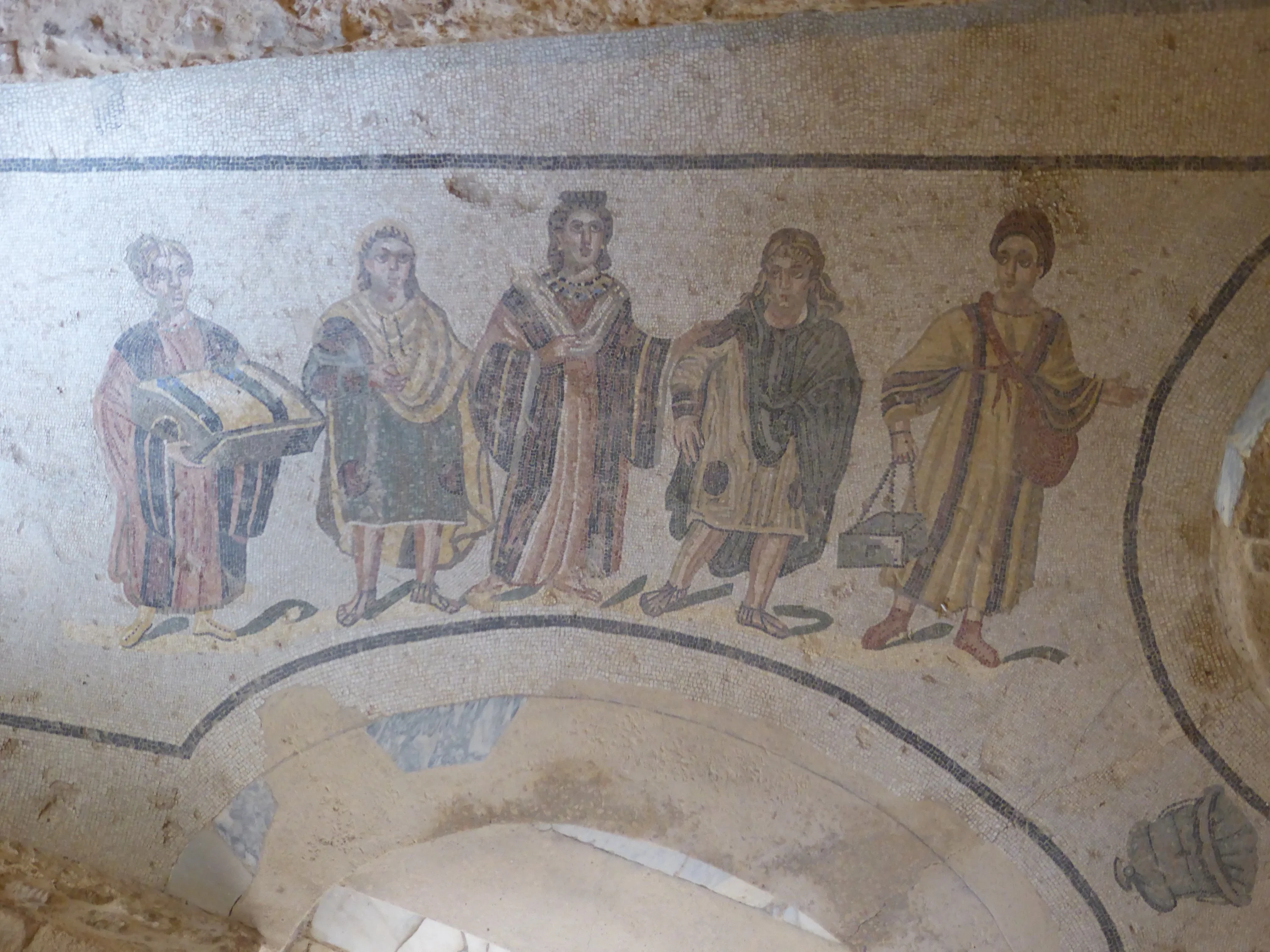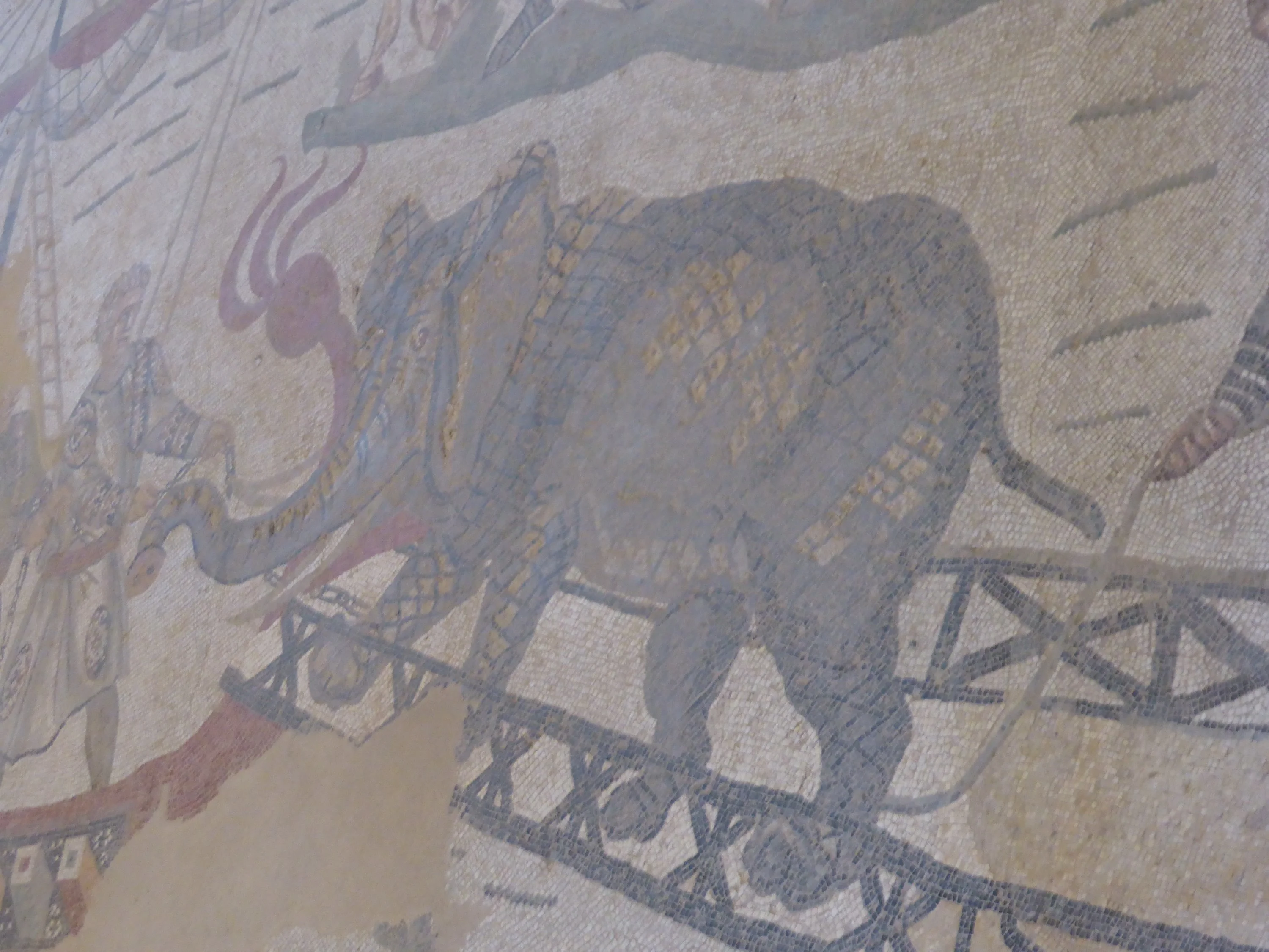 Riesige Flächen gut erhaltener Mosaiken gab es zu sehen, zum Leidwesen der Fotografin aber dunkel überdacht. Man lief über Bohlenwege drüber und es war furchtbar voll, lange stehen bleiben und mit der Belichtung experimentieren ging nicht. Wärend wir unsere Führung per Audiosystem in Sprechlautstärke bekamen, vermurxte hinter uns eine Dame in Schreilautstärke die französische Sprache - irgendwann wollte ich da nur noch weg.