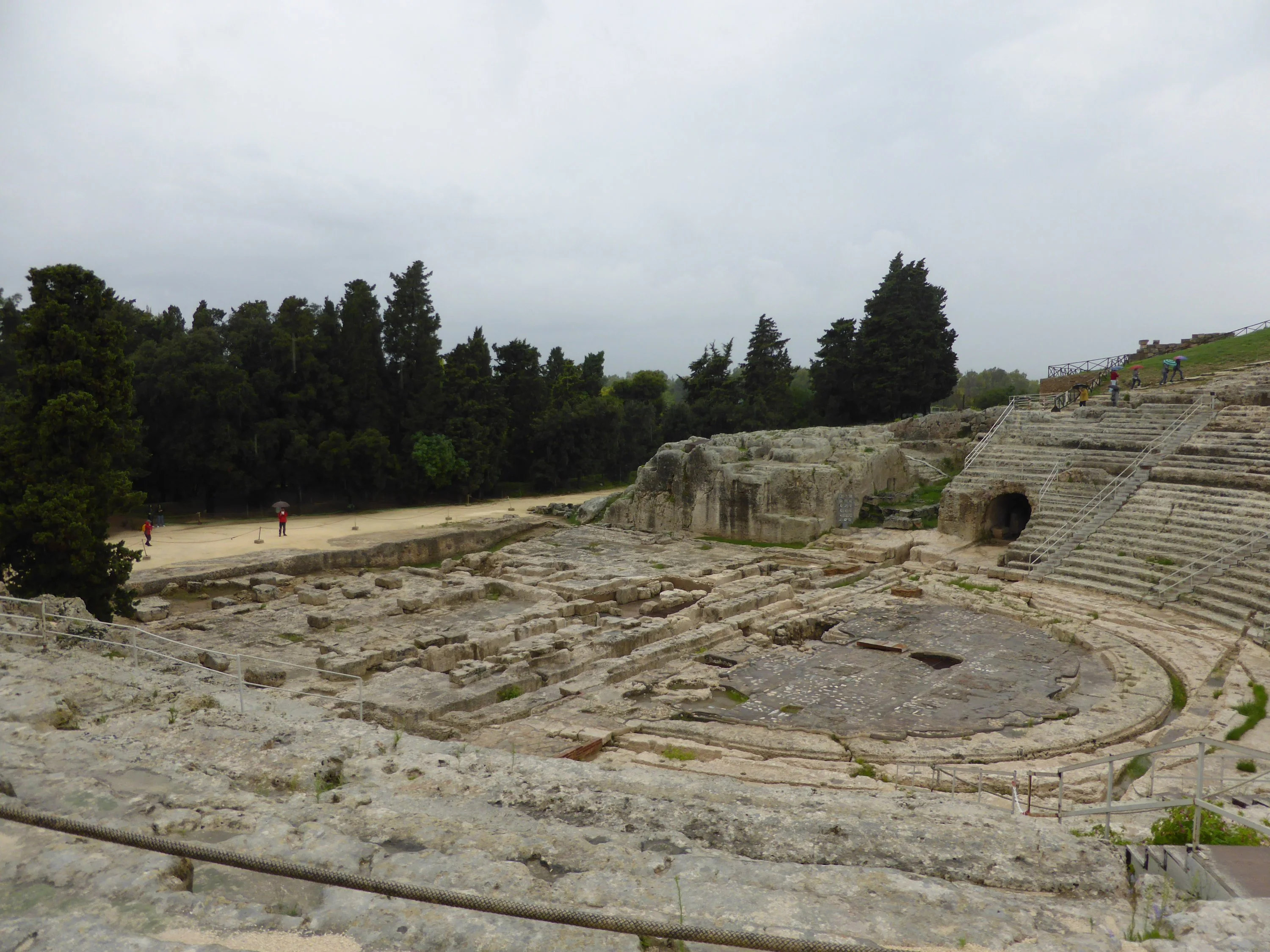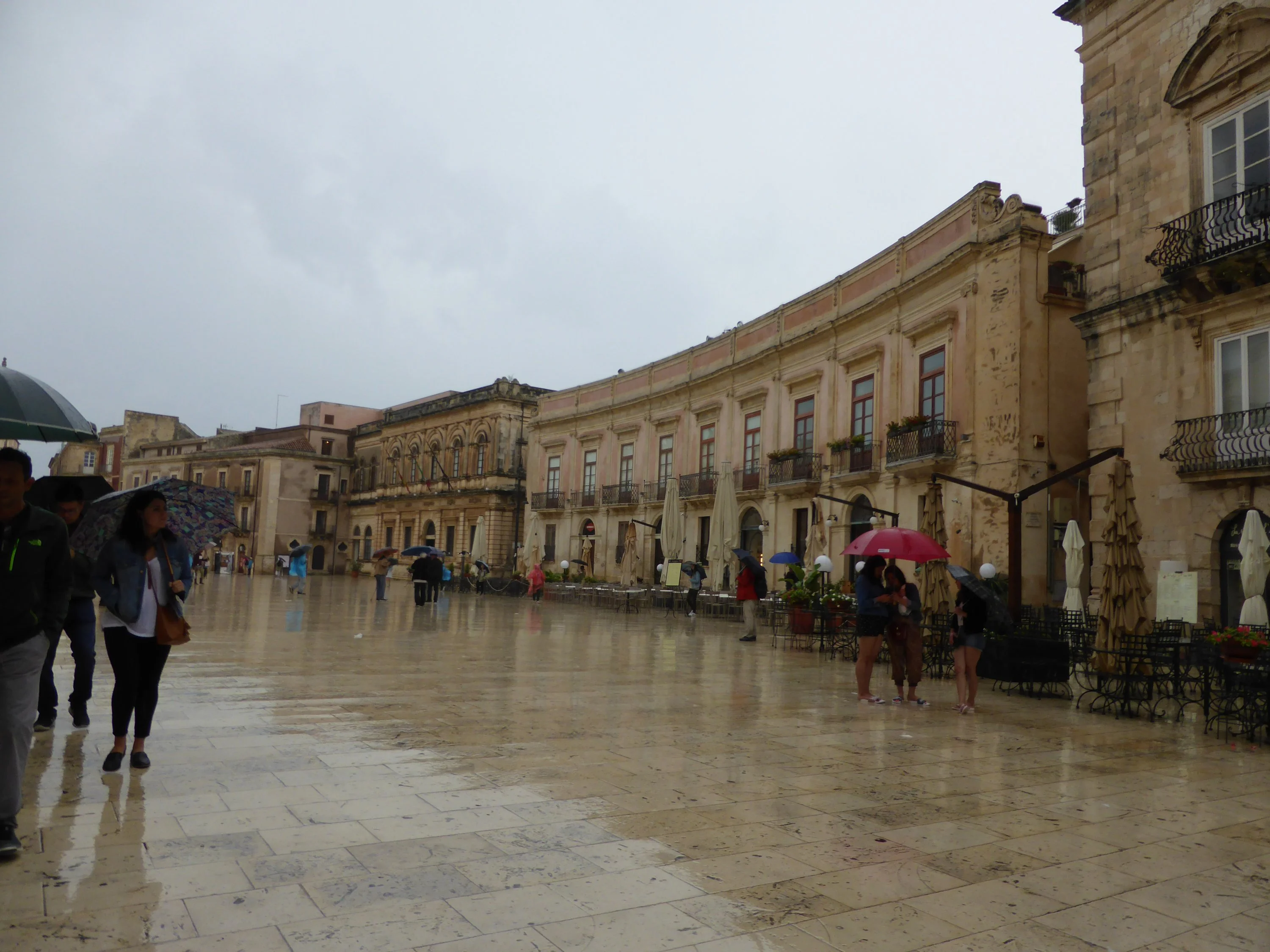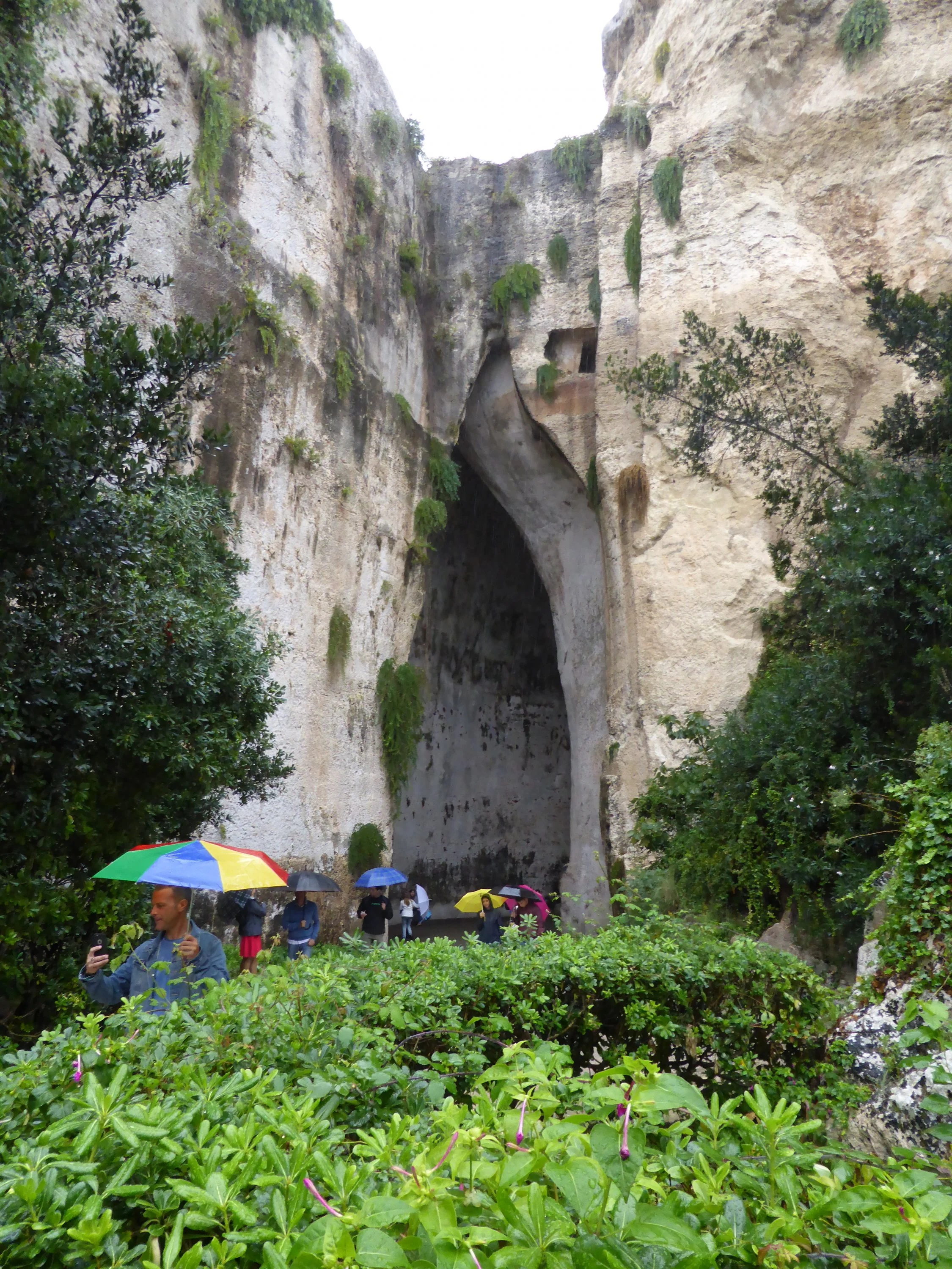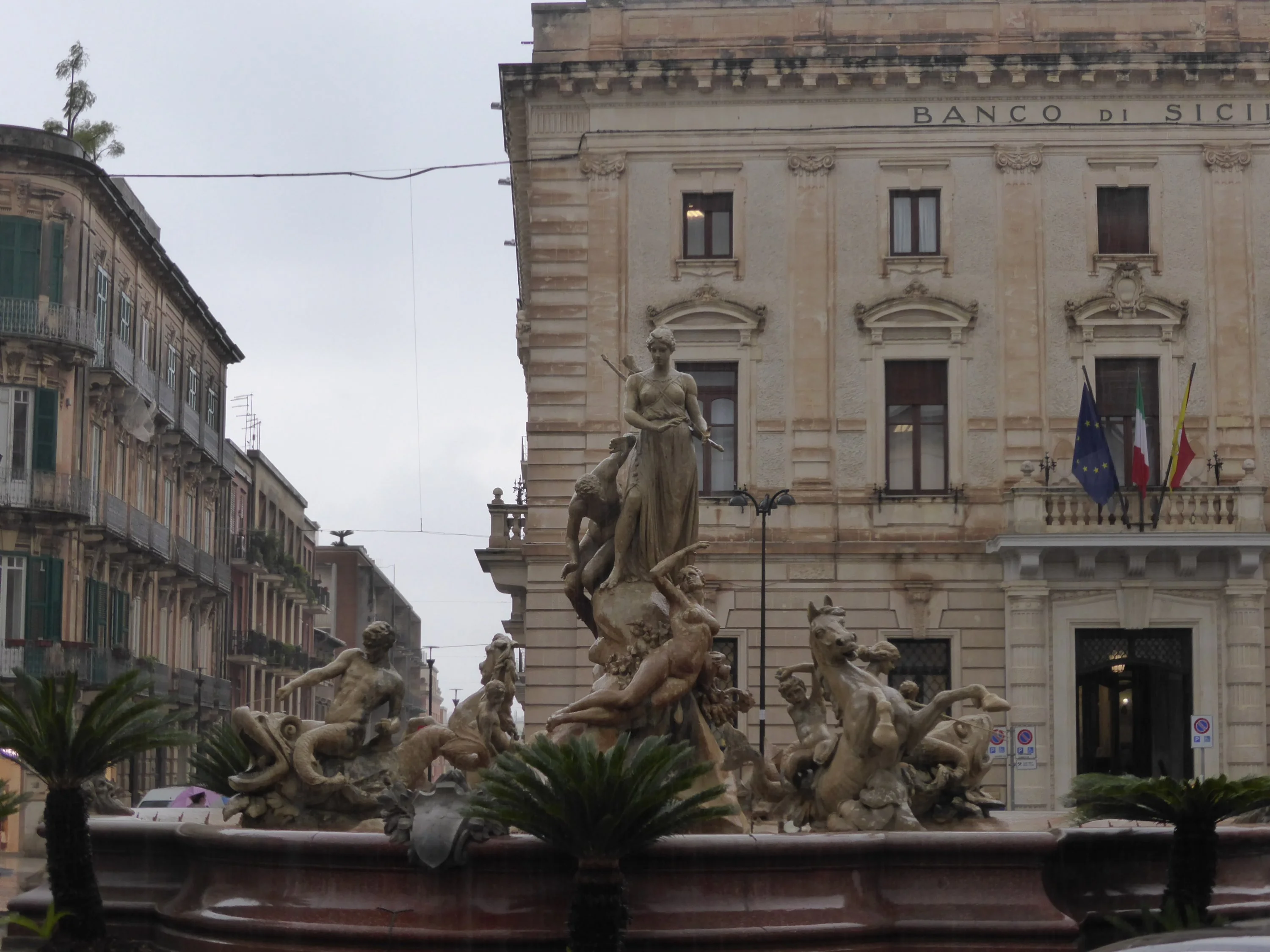 Es regnet immer noch. Kaum, dass man zum Frühstück ins Hauptgebäude laufen mag. Wir starten nach dem Frühstück nach Syrakus, das auf dem Weg liegende Catania schauen wir nur vom Bus aus an. (Da habe ich durch verregnete Scheiben nicht fotografiert.)