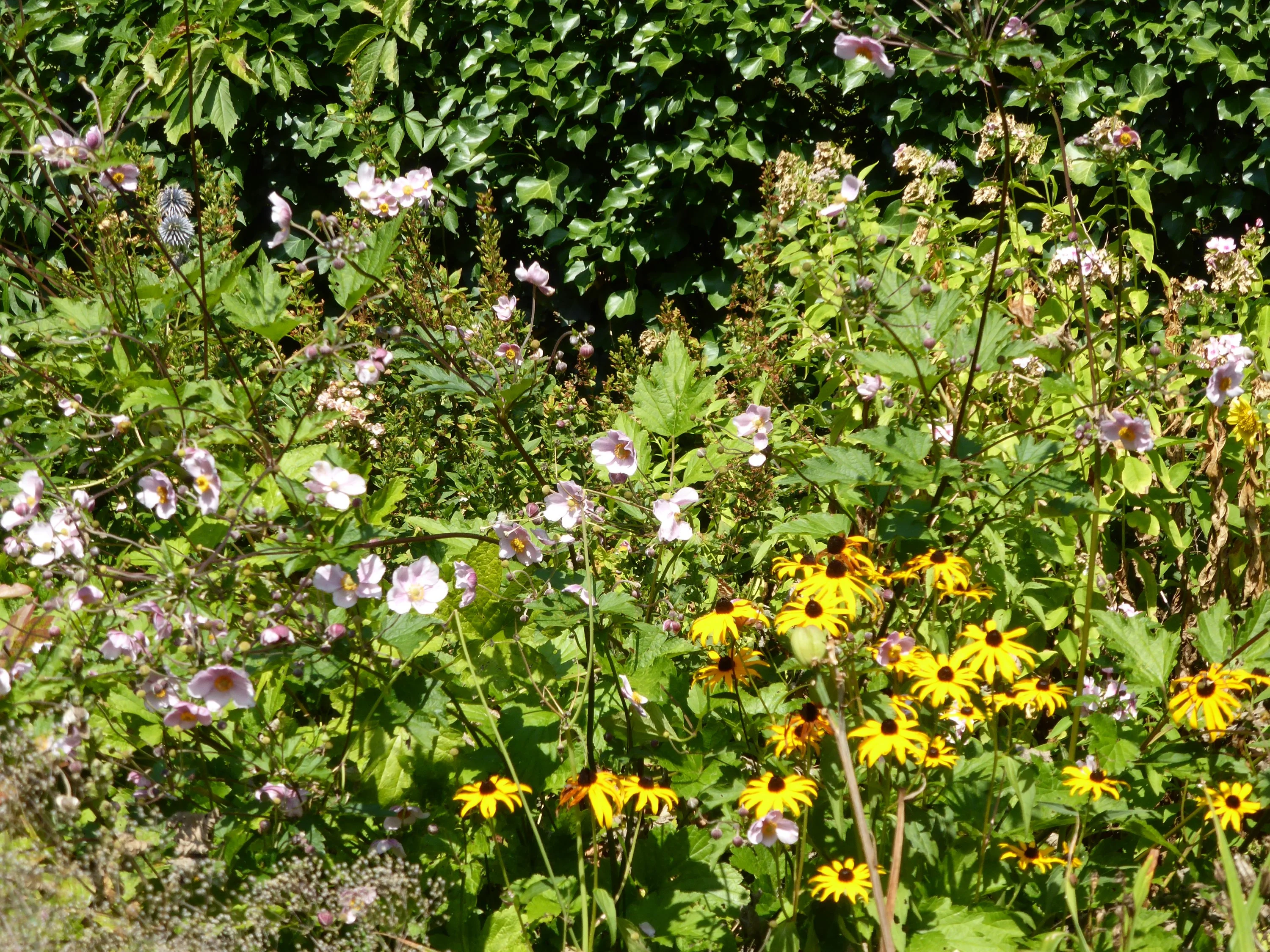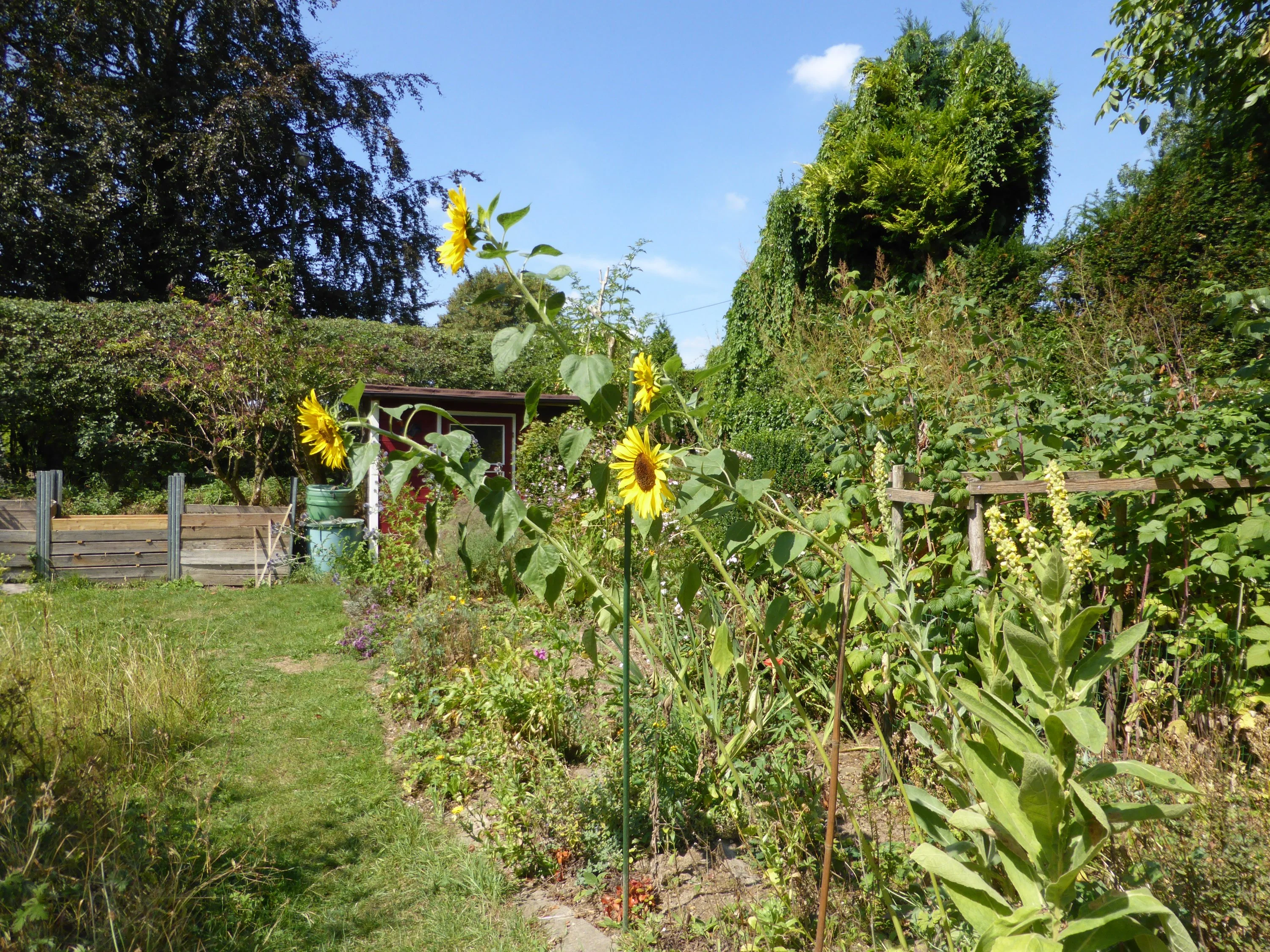 Ein oberflächlicher Blick zeigte noch erstaunlich viel Grün. Aber ich habe mal die Blumen genauer angesehen, weil ich einen Blumenstrauß schneiden wollte. Meine Mutter hätte am Sonntag Geburtstag gehabt und wir wollten ihr einen Strauß Gartenblumen auf's Grab stellen. Bei näherer Betrachtung war aber keine Blüte mehr so, dass man ihr ein paar Tage in der Vase zugetraut hätte. So haben wir in der Gärtnerei eine Mini-Sonnenblume gekauft und sie mit Topf hingestellt, das hält wenigstens ein bischen und sieht nicht so traurig aus.