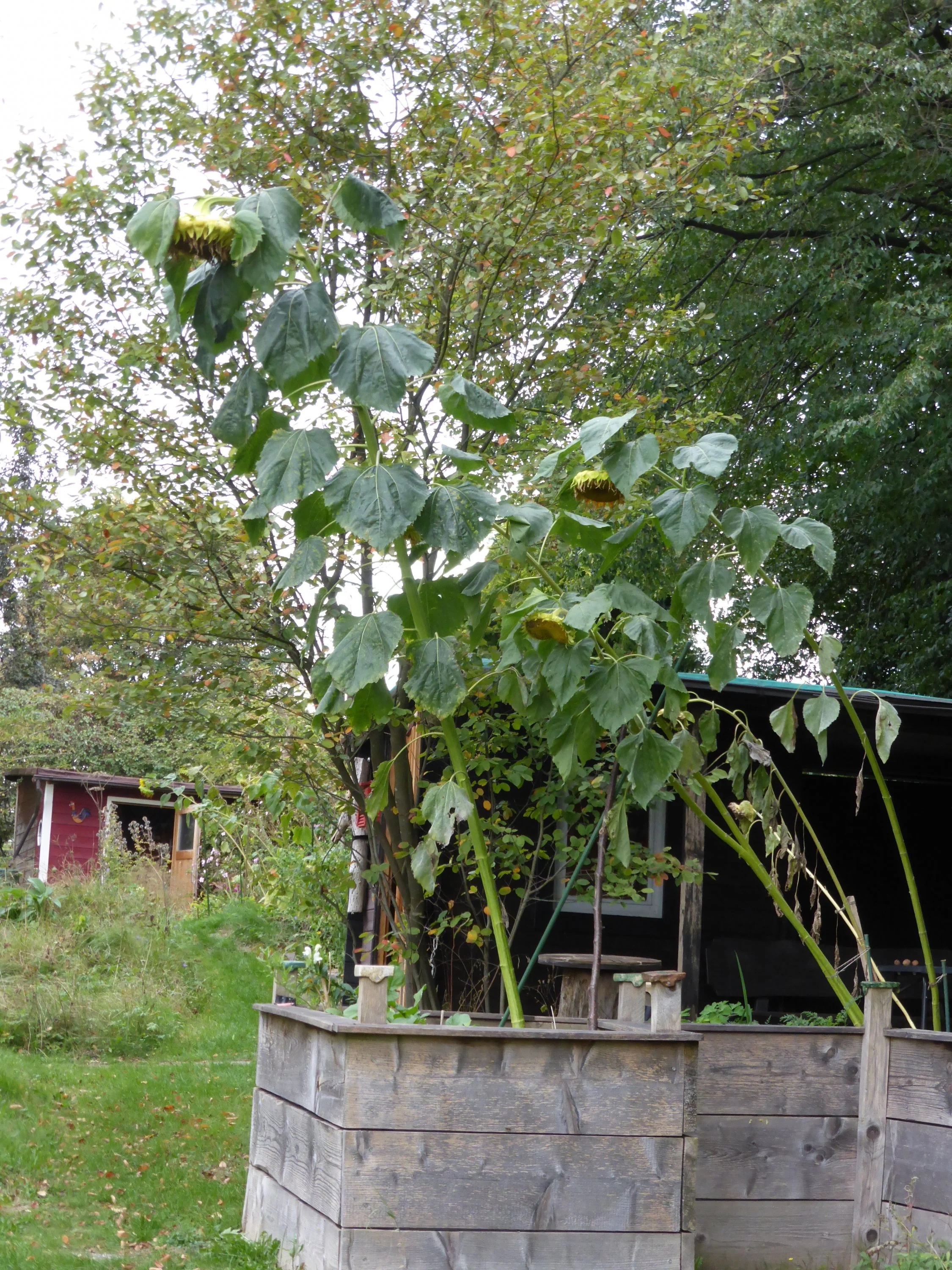 Unsere größte Sonnenblume steht im Hochbeet, aber wir kommen nicht zum Messen dran. Genaue Größe wissen wir also erst, wenn sie rauskommt. Zum Schätzen: Die kurze Kannte des Hochbeets im Vordergrund misst 1m.