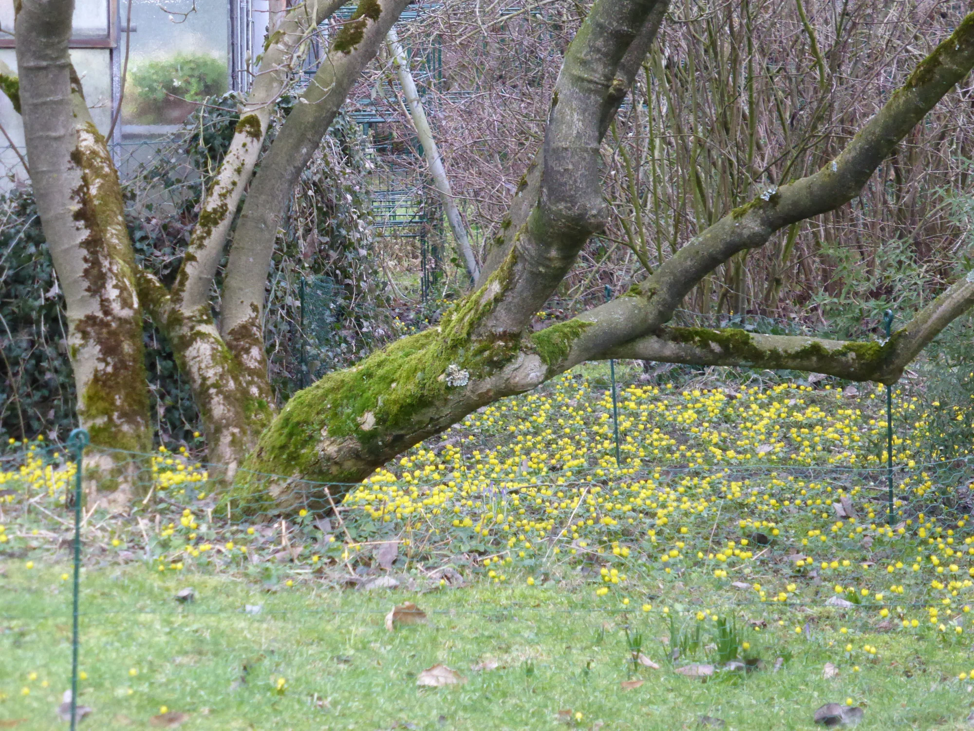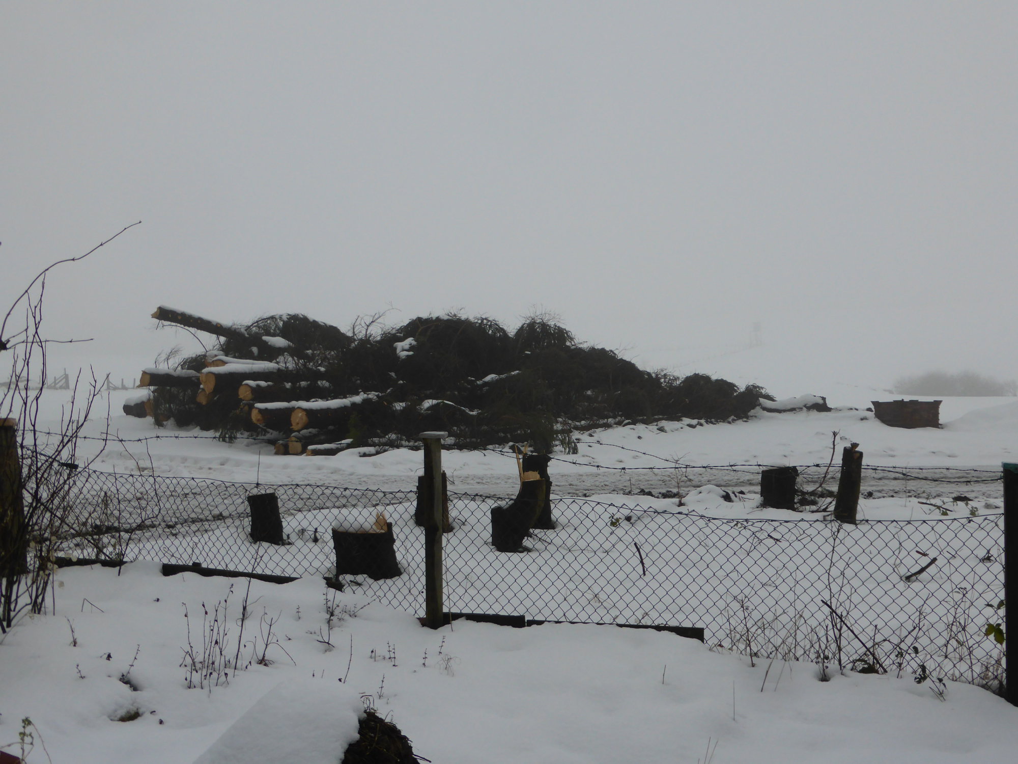 Der Nachbar hat noch mehr von den Fichten gefällt, die sein Vater uns mit "die werden nicht hoch, die ernte ich als Weihnachtsbäume und verkaufe sie" direkt an die Grundstücksgrenze gepflanzt hatte. Nach Osten (untere Grundstückskannte) zu haben unsere Beerensträucher dadurch endlich wieder Licht. Nach Norden, wo sie uns keinen Schatten gemacht haben, fehlt jetzt der Sicht- und Windschutz, aber auch die hohen Baume, die jedes bischen Wasser aus dem unteren Gemüsebeet gezogen hatten, dafür das Beet mit dichtem Wurzelgeflecht zuwucherten.