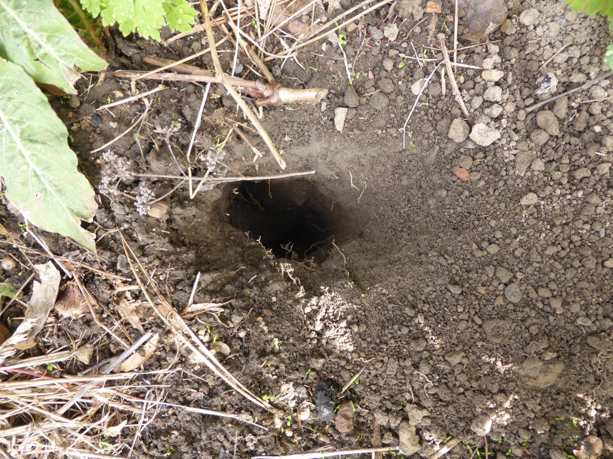 Im Gemüsebeet (und auch an zwei Stellen in der Wiese) gibt es solche riesigen Löcher, und wir wissen nicht, wer dort wohnt. Mein Vater sagt, dass er seit einiger Zeit keine Wühlmausspuren mehr hat, dafür im unteren Teil aber reichlich Löcher von Feldmäusen. Für die sind diese Löcher aber zu groß. Bei so großen Löchern und den fehlenden Wühlmäusen kann man schon überlegen, ob vielleicht ein Wiesel oder ein Marder bei uns eingezogen ist. Das Tier wäre natürlich sehr willkommen, auch wenn es gräbt.