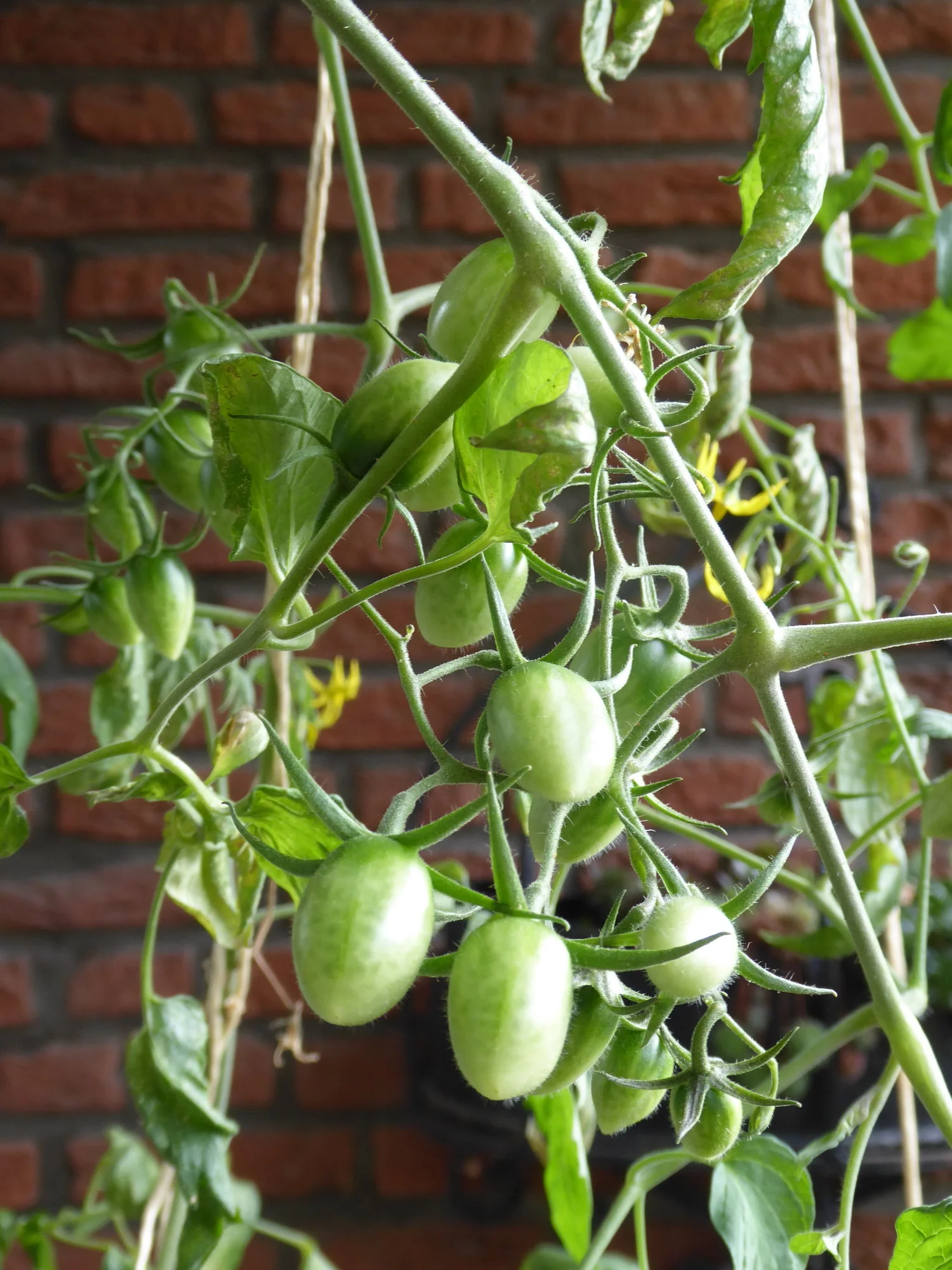 Die Gelbe Chinesische Coctailtomate blüht und fruchtet, als sei Juli/August und nicht, als stünde der Oktober kurz bevor. Das Laub sieht allerdings gruselig aus, in weiten Partien habe ich das komplett vertrocknete Blattwerk auch abgemacht. Gesund sieht anders aus, aber für die Jahreszeit unternehme ich jetzt auch nicht mehr viel.