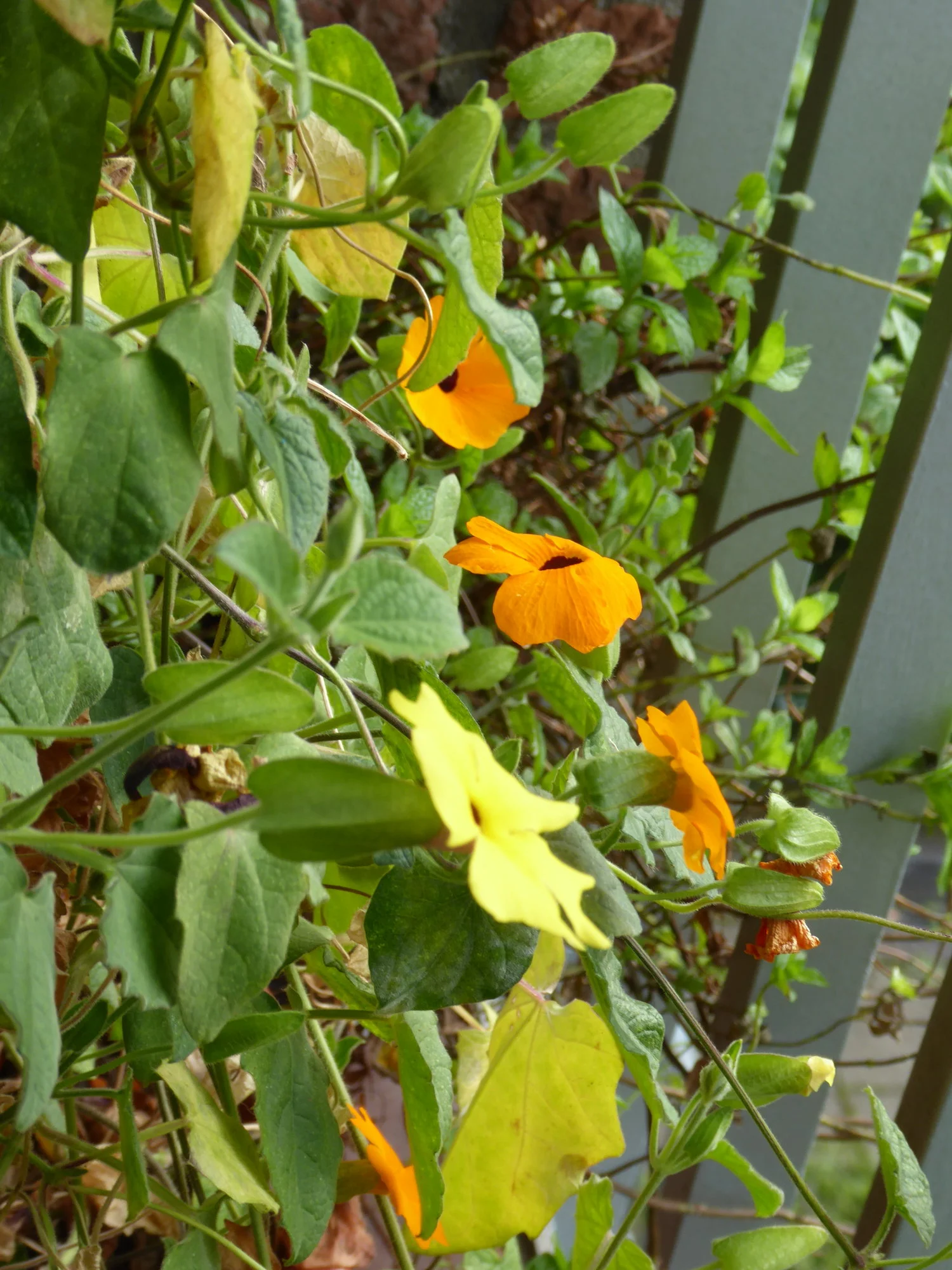 Die Halbampel mit den hauswurzen taucht aus dem Tomatenurwald auch wieder auf (vom Wohnzimmer aus kann ich sie ganzjährig sehen), Die Susannen sind noch eifrig am Blühen und auch die blaue Mauritius schaut so aus, als wolle sie, wenn der Winter nicht zu hart wird, noch ein weiteres Jahr bei mir bleiben.
