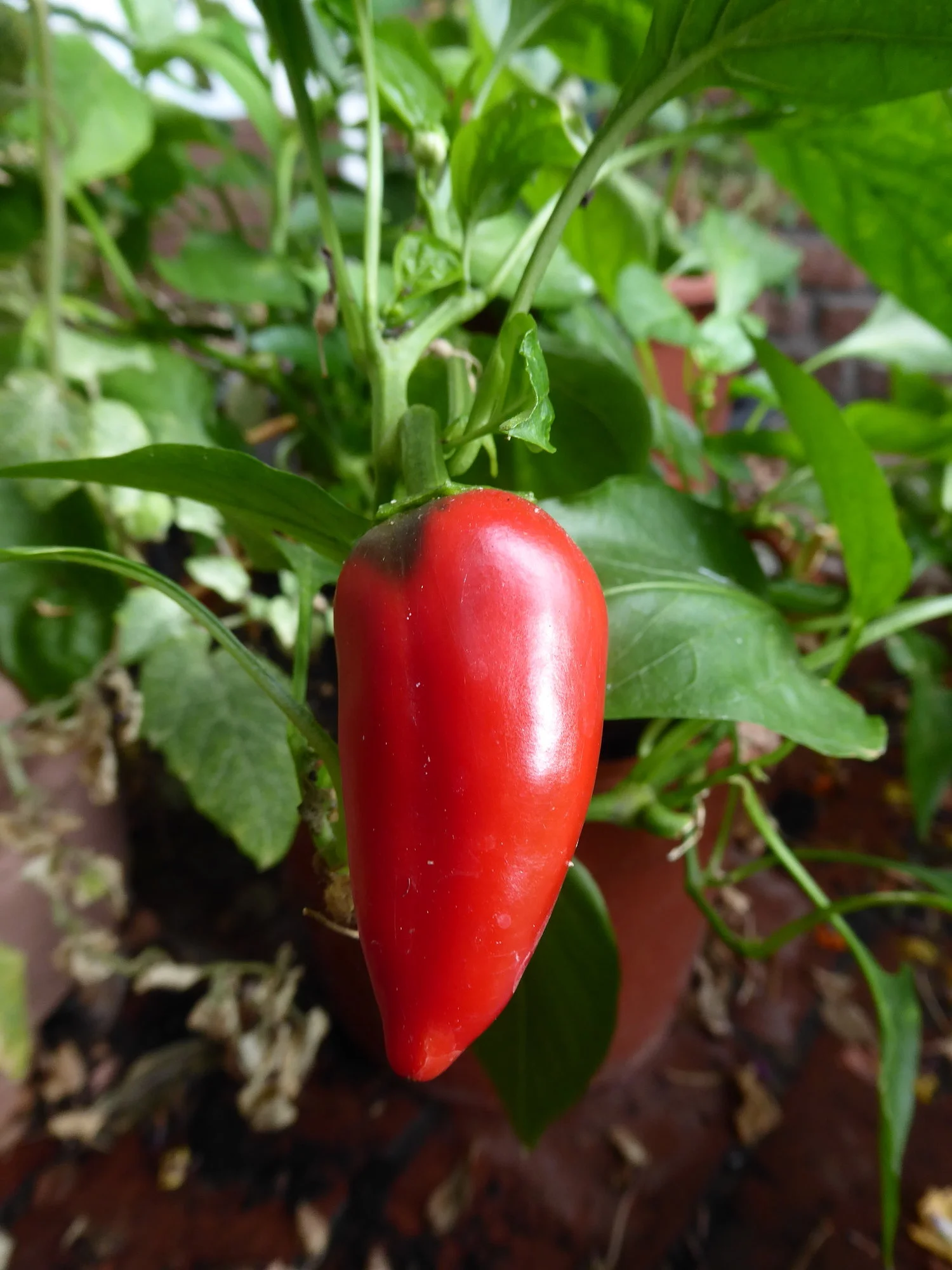 Die Rote Snackpaprika hat immer noch zwei reife Früchte und sehr gesundes Laub. Sehr unkompliziert und pflegeleicht, meine ersten Paprika überhaupt.