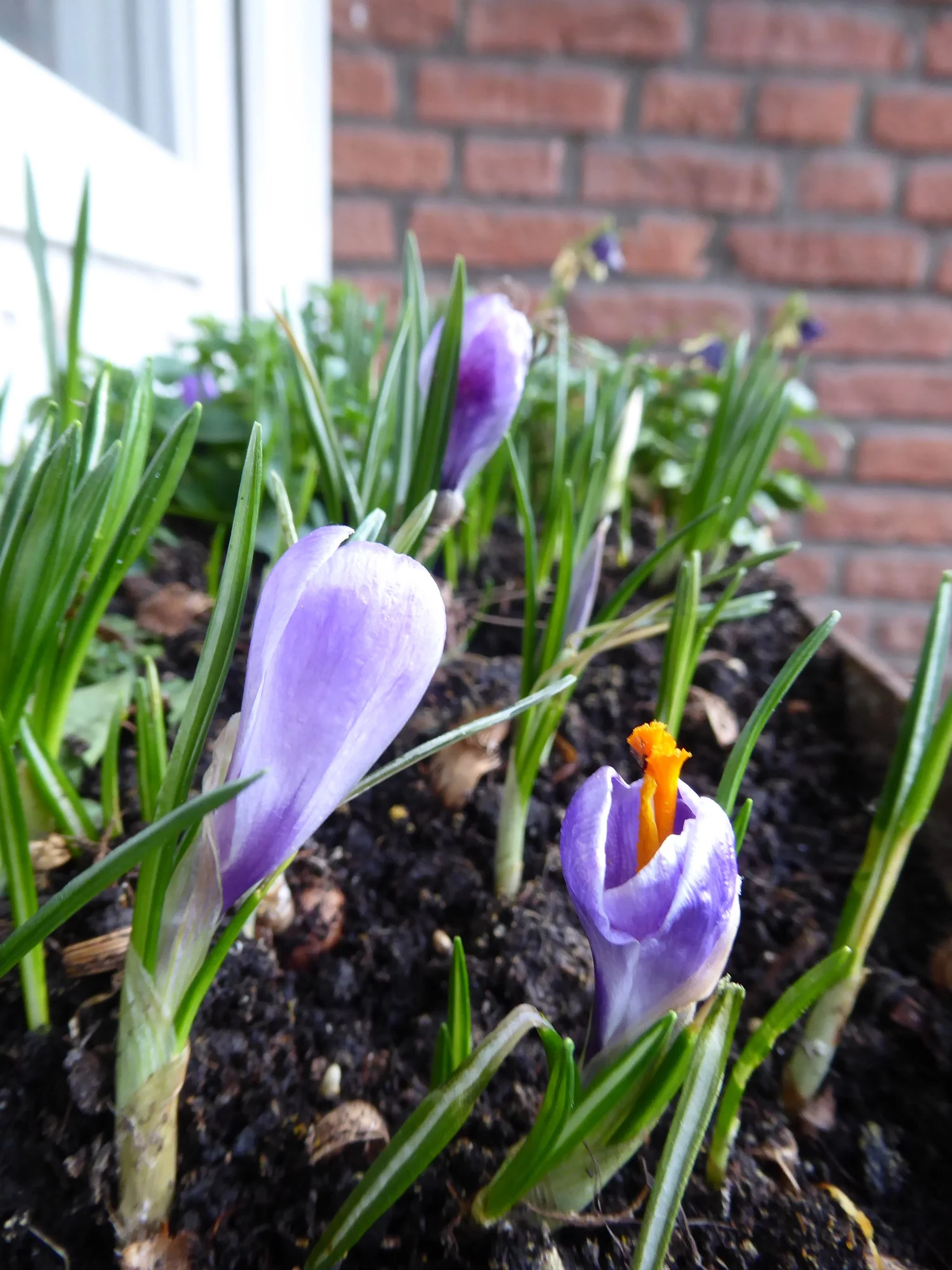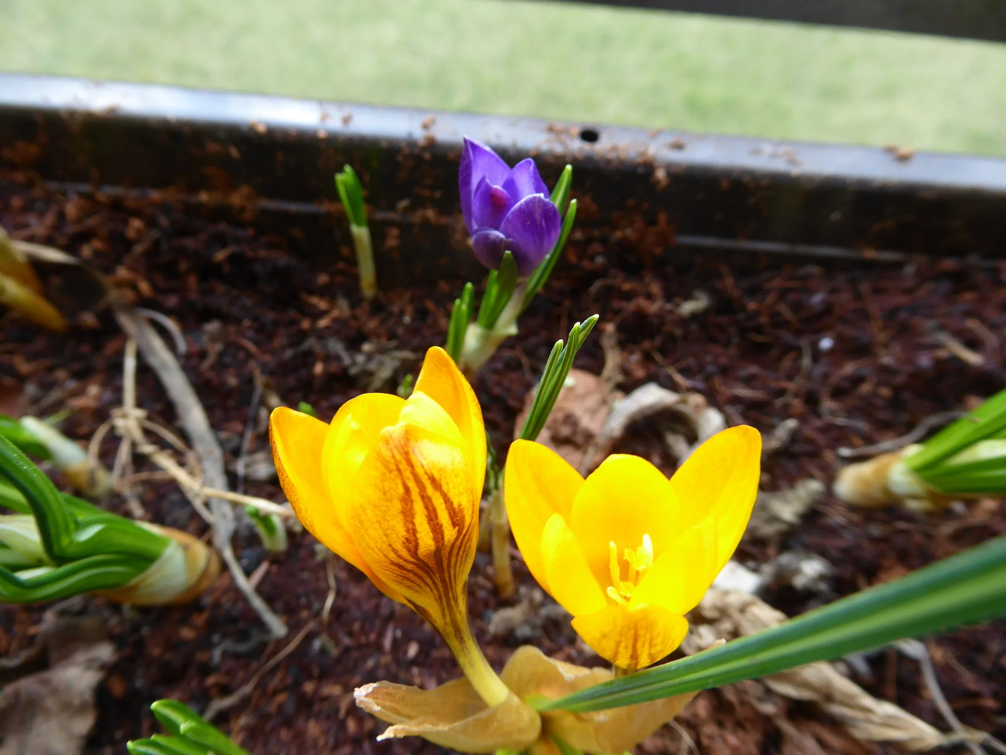 Zu den gelben Krokussen kommen jetzt doch auch violette dazu. Ich weiß, dass da auch noch weiße im Kasten sein müssen, irgendwie seltsam, dass sie so arg zeitversetzt blühen, ich hatte welche genommen, für die der gleiche Blühzeitraum angegeben war.