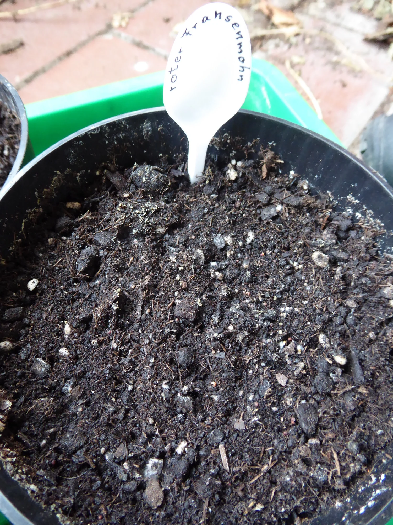 Im Anzuchthäuschen draußen stehen die drei Töpfe, die ich als Kaltkeimer rausgestellt habe. Patagonisches Eisenkraut, Lupinen und ein roter Fransenmohn. Die Lupinen keimen tatsächlich schon. Sie bleiben aber draußen, damit sie schön kräftig werden. Der Deckel des kleinen Anzuchthäuschen soll auch nnur vor neugierigen Pfötchen und Schnäbeln schützen.