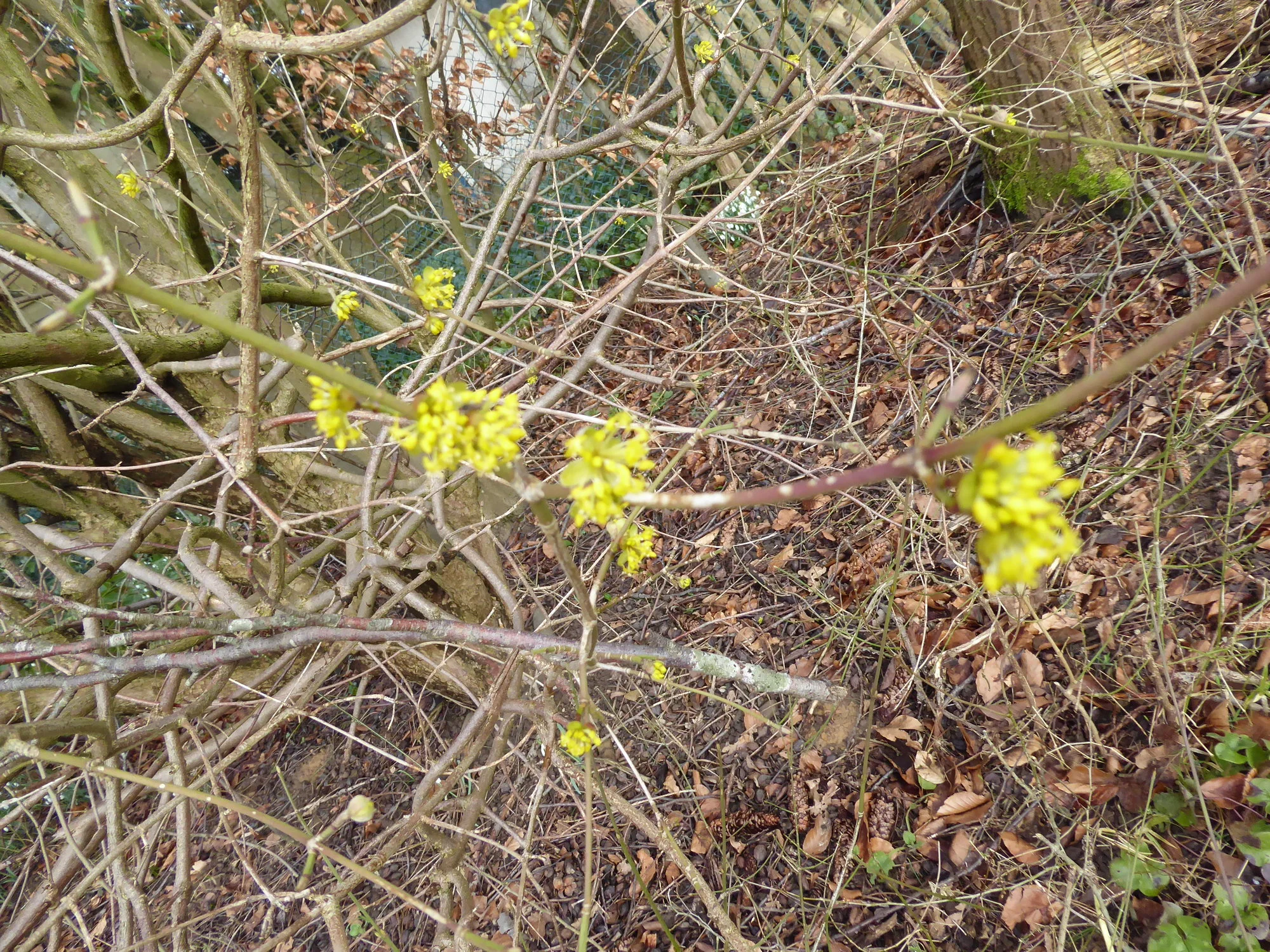 Sonst war es im Garten richtig schön. Die Krokusse blühen auch dort, Schneeglöckchen auch, die kleinen Narzissen und Primeln treiben aus, der seltsame Lauch steht da und die große Kornellkirsche blüht endlich. Die Clematis treibt aus und zwei Muskatellersalbeipflanzen haben auch den Winter überstanden.