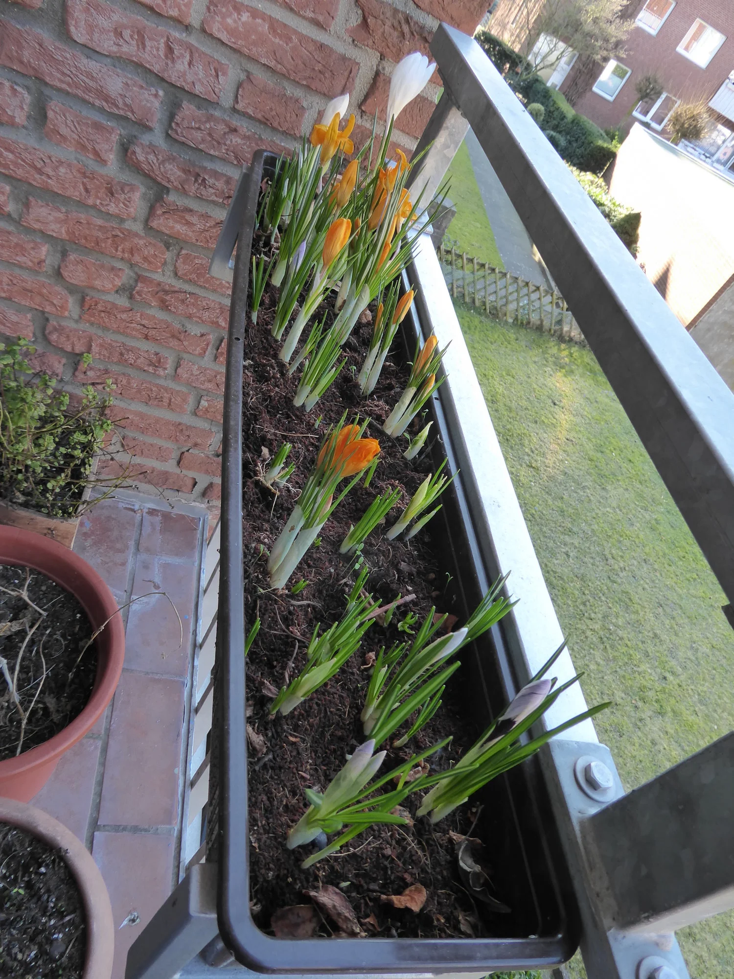 Dadurch, dass ich Narzissen zu den frühen Iris, die so gut wie vorbei sind, gesetzt habe, konnte ich die Kästen nicht durchtauschen und habe jetzt seit ganz langer Zeit das erste Mal 3 Kästen am Geländer hängen. Den Krokuskasten konnte ich in die Halterung einquetschen, die das Balkongeländer schon baubedingt mitgebracht hat.