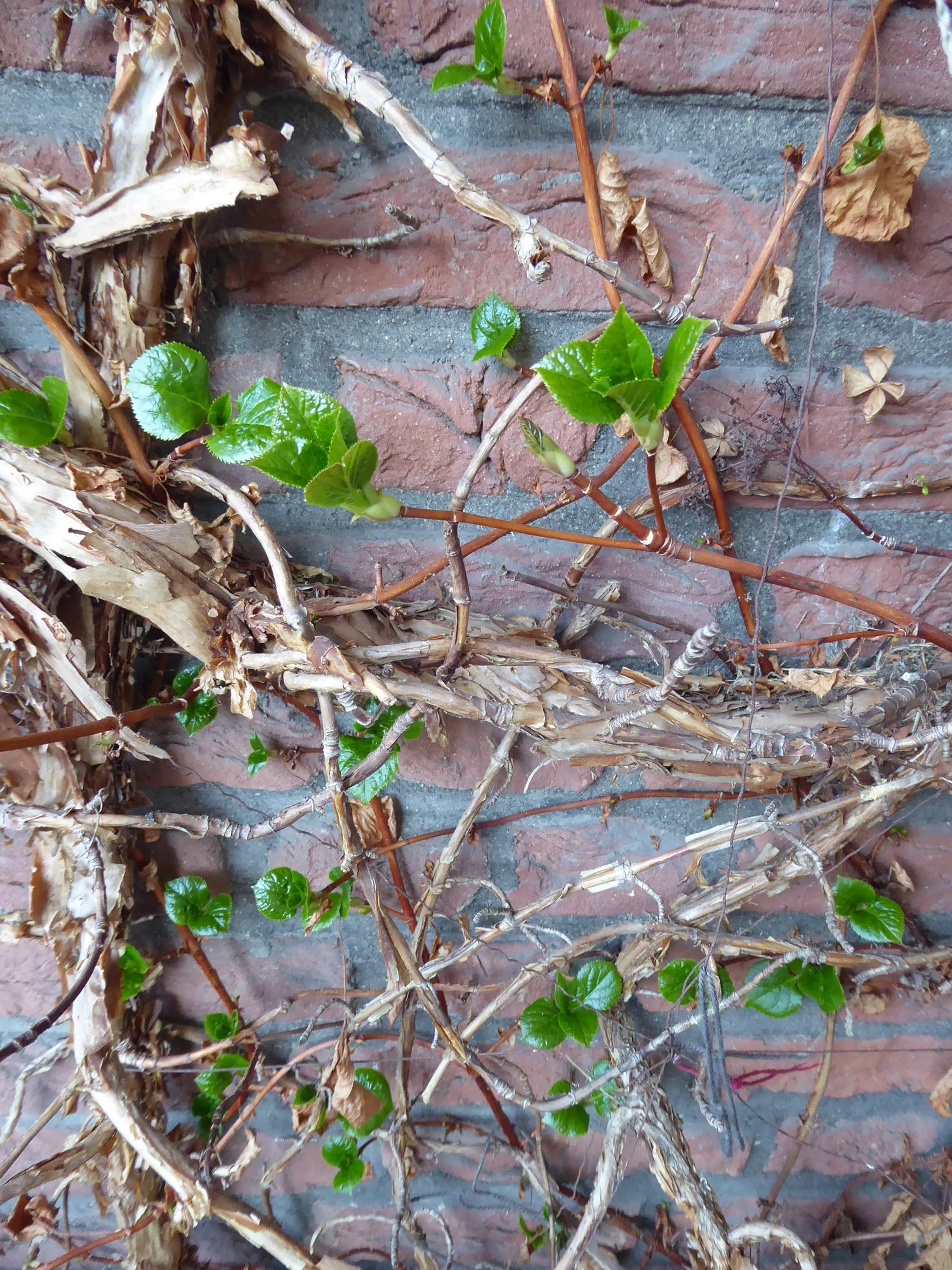 Meine Kletterhortensie beginnt, ihre Wand wieder zu begrünen.