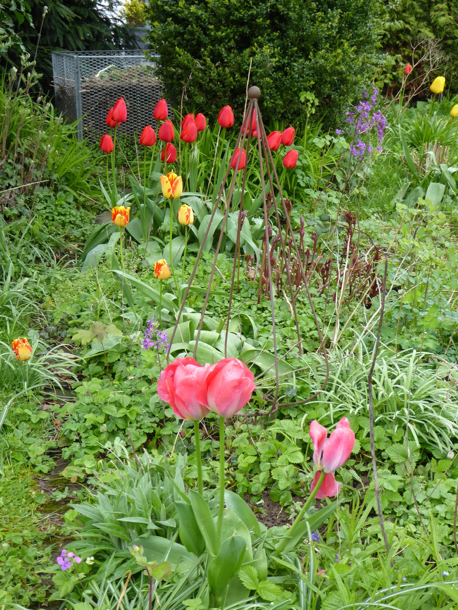 Diese leicht rosa Tulpen sind mir letztes Jahr als rote Tulpen auf dem Markt verkauft worden. Gut, dass mein Vater, der diese seltsame Farbkombi ja viel länger ansehen muss, die Sache sehr gelassen sieht. Hauptsache, es ist bunt und lebendig. Ich finde die roten und die rosa Exemplare, wenn sie zu nahe aneinander stehen, schon etwas schrill.