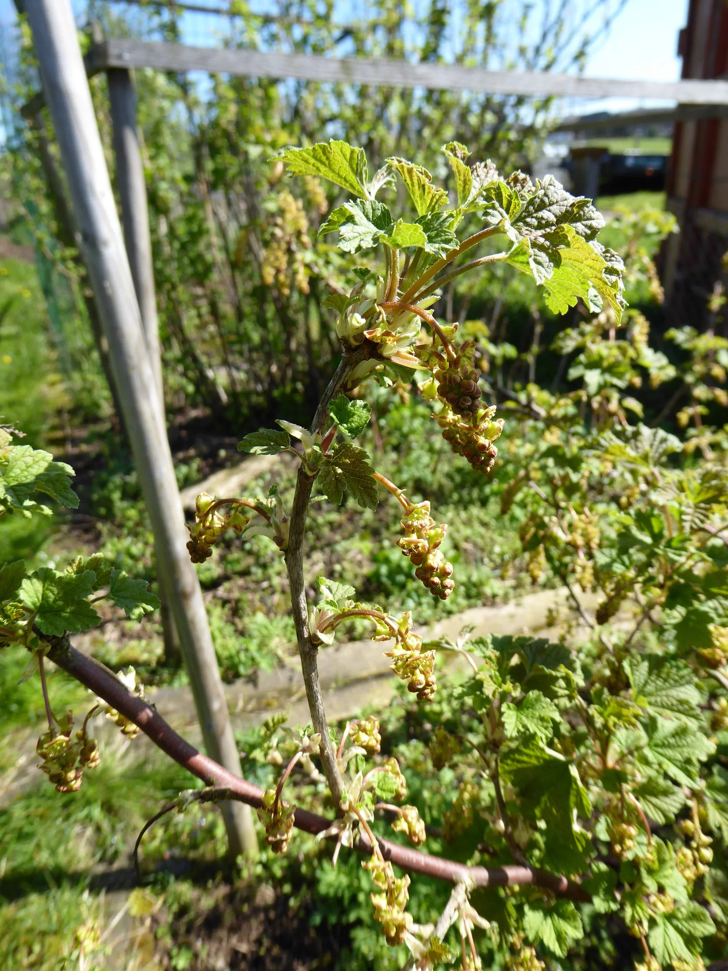 Die Beerensträucher setzen auch gut an. Nur die kleine schwarze Johannisbeere (also, der zweite Busch) dem ist irgendwas zugestoßen. Er hat kaum noch Kontakt zu seinen Wurzeln. Dafür haben die Markierungspinnchen vom letzten Jahr Wurzeln geschlagen - vom Blatt her eindeutig Johannisbeere.