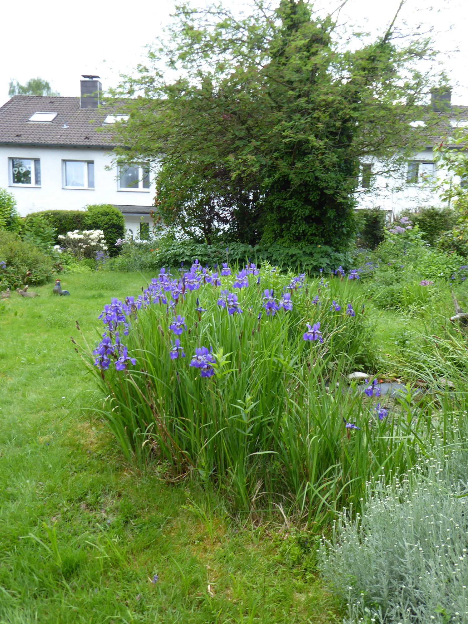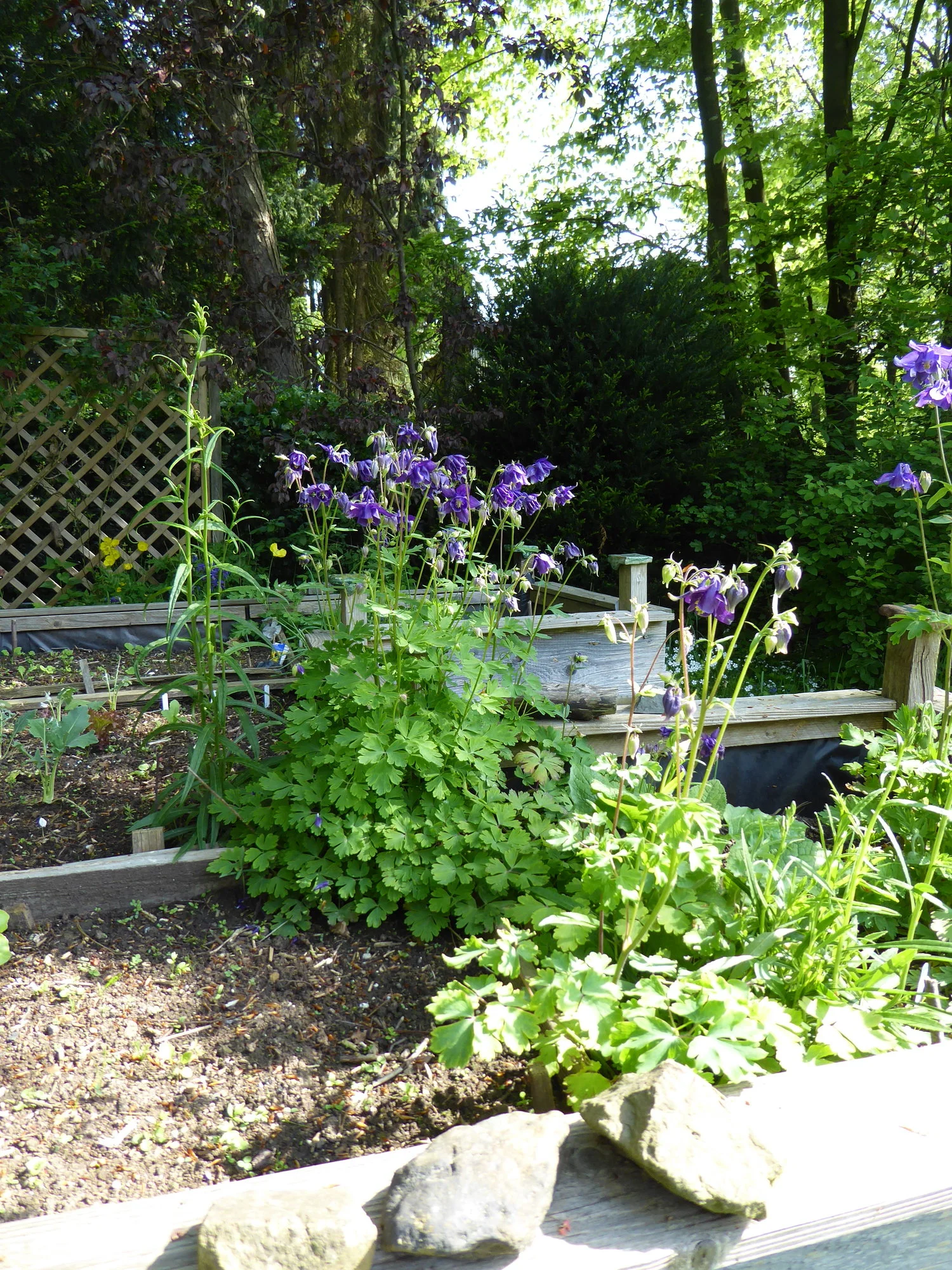 Der obere Garten war jetzt blau vor Akeleien und sommerlich warm. Besonders am Samstag flogen Mengen kleiner Juni-Käfer herum, dabei haben wir doch erst Mai. Fürs Foto waren die Kleinen etwas unkooperativ, einen habe ich mit Mühe aufs Foto bekommen.
