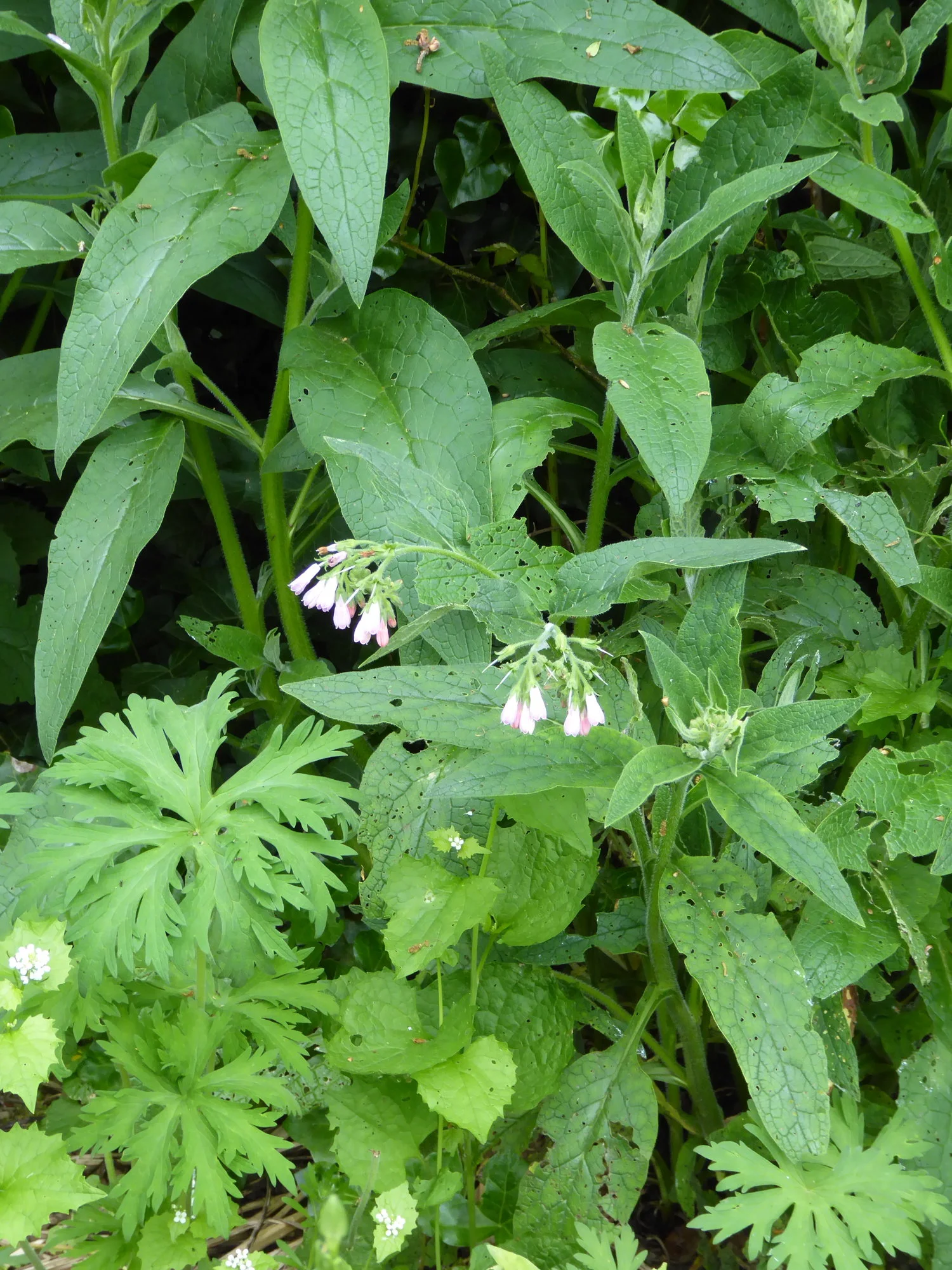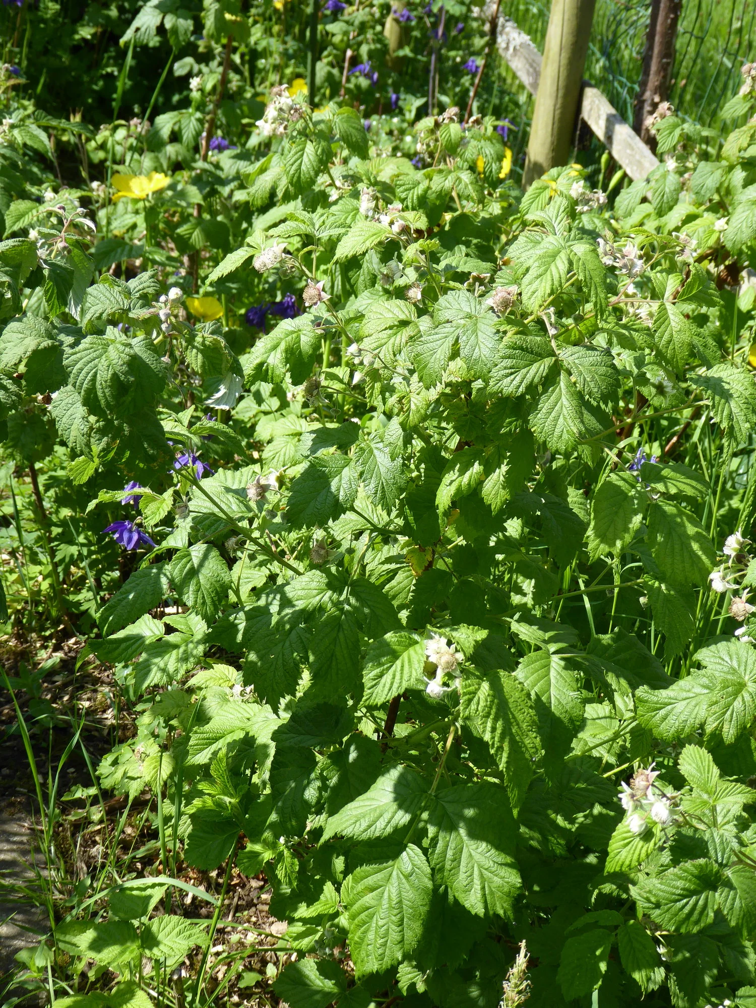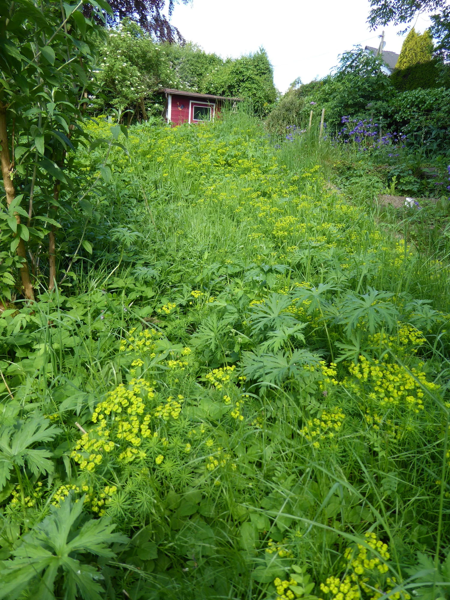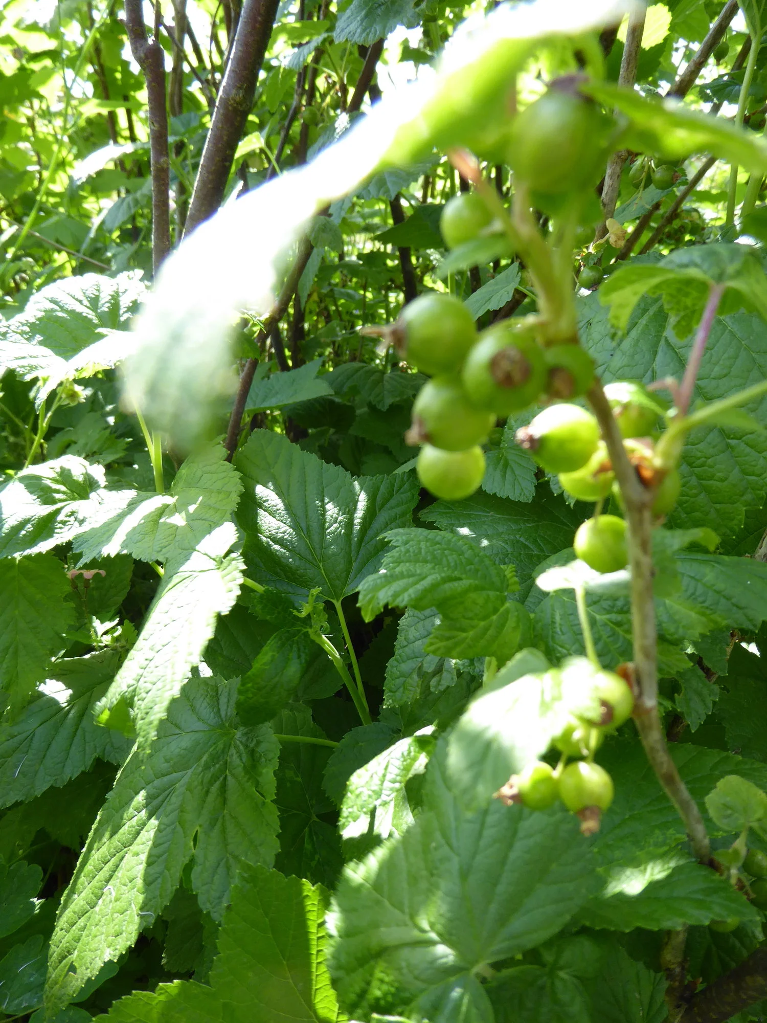 Ich habe viel Zeit verbracht, aus diesem Gewühl eine schwarze Johannisbeere freizulegen. Gut eine Schubkarre voll Brennnesseln und Brombeerranken habe ich gezogen, jetzt schaut die Johannisbeere, die sogar tapfer Beeren angesetzt hat, wieder raus.
