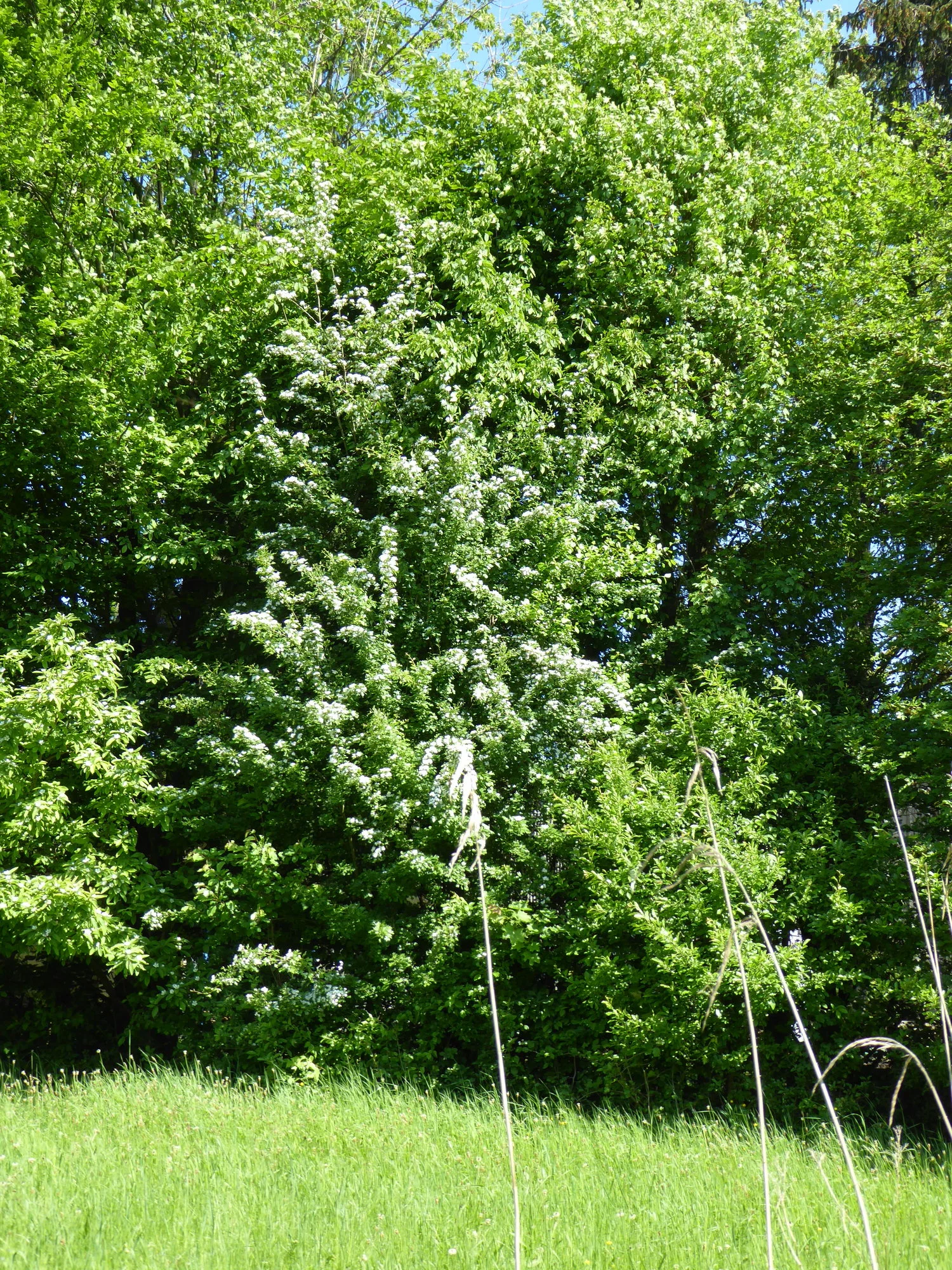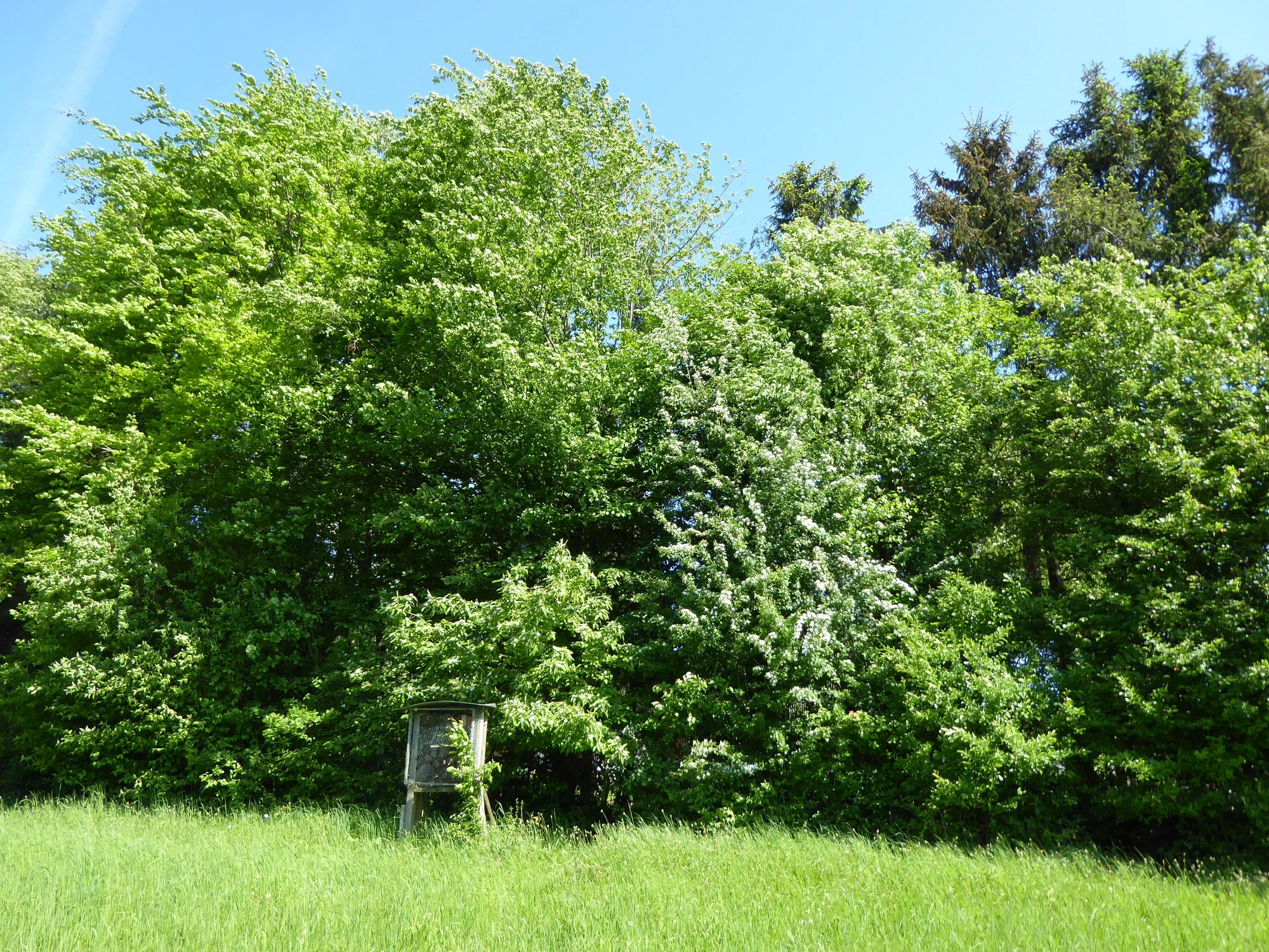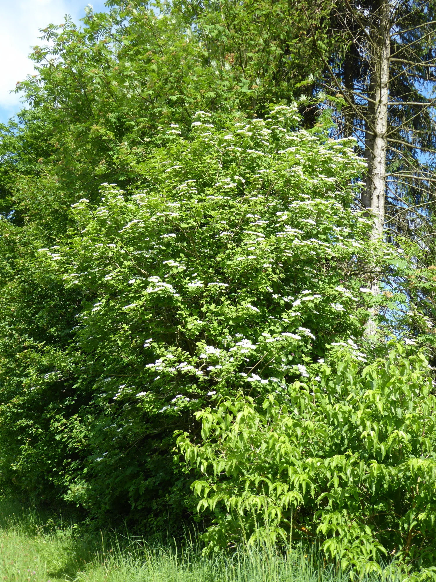 Der Schneeball taucht alles in die nächsten weißen Blüten, die Pfaffenhütchen sind zum Teil von Gespinnstmotten befallen. Aber die Vögel wollen auch was fressen, also sollte es kein großes Problem geben.