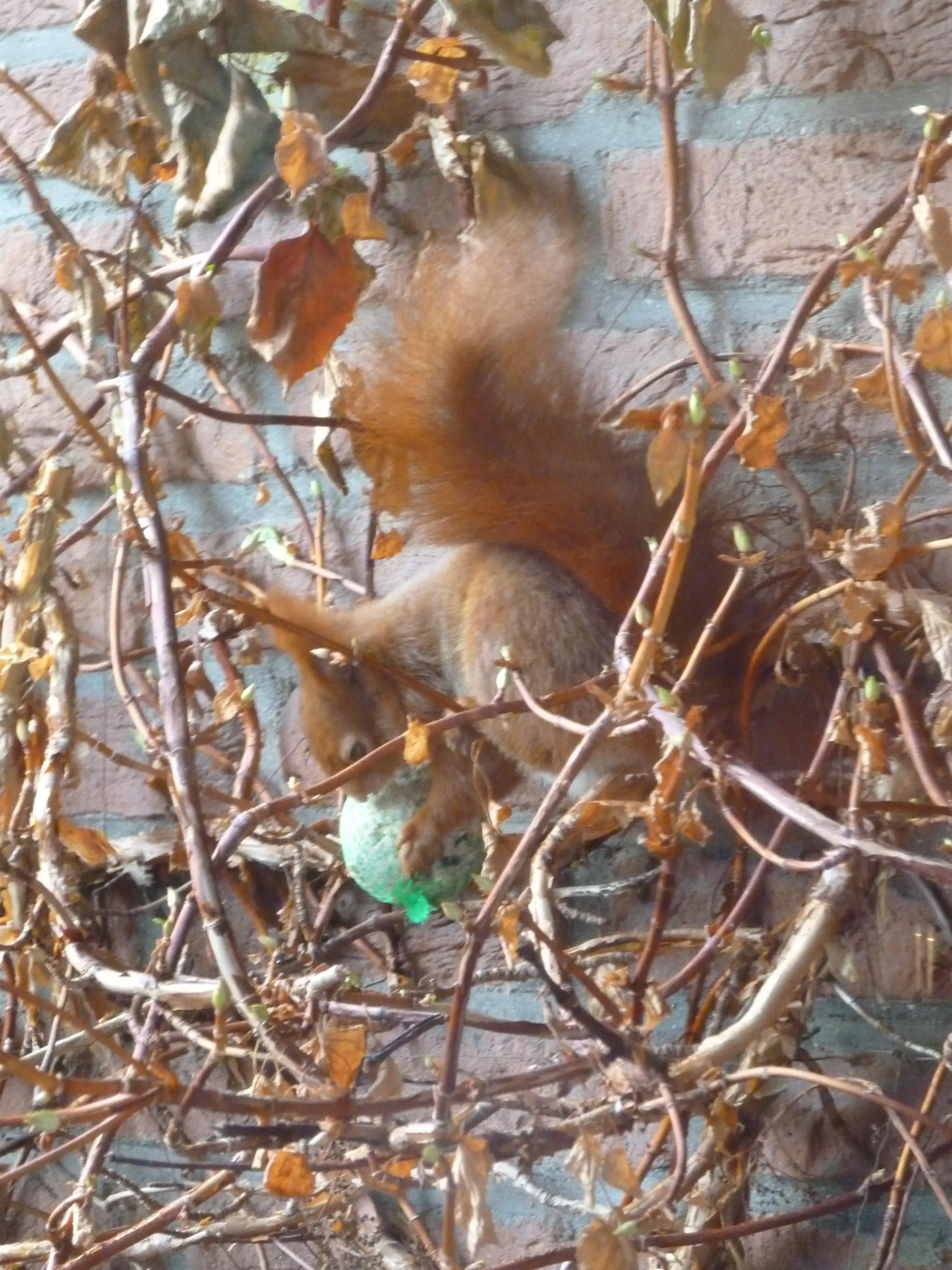 Ich dachte ja, ich hätte Meisenknödel aufgehängt. Da habe ich mich wohl getäuscht - es ist ein Eichhörnchenknödel!