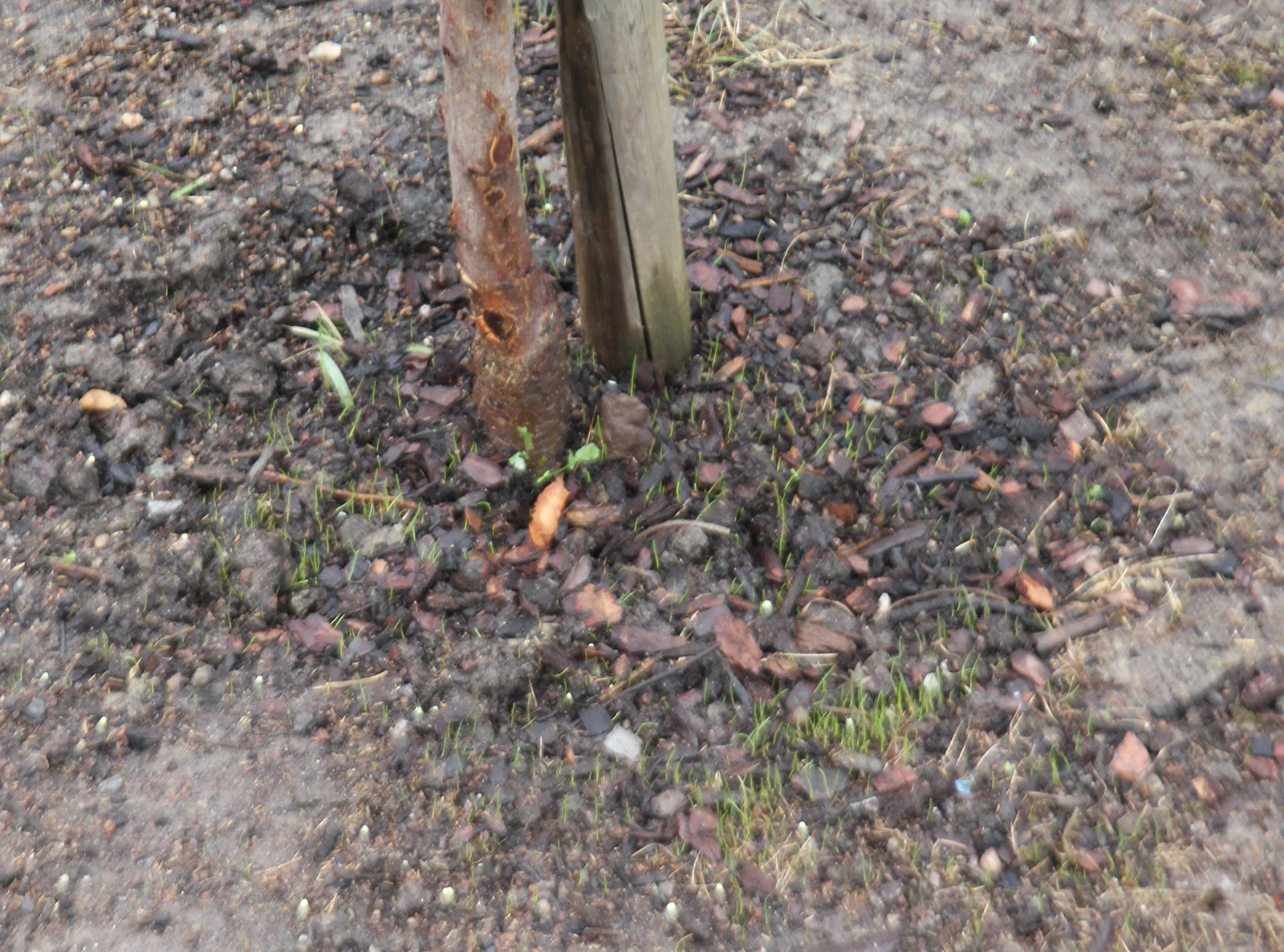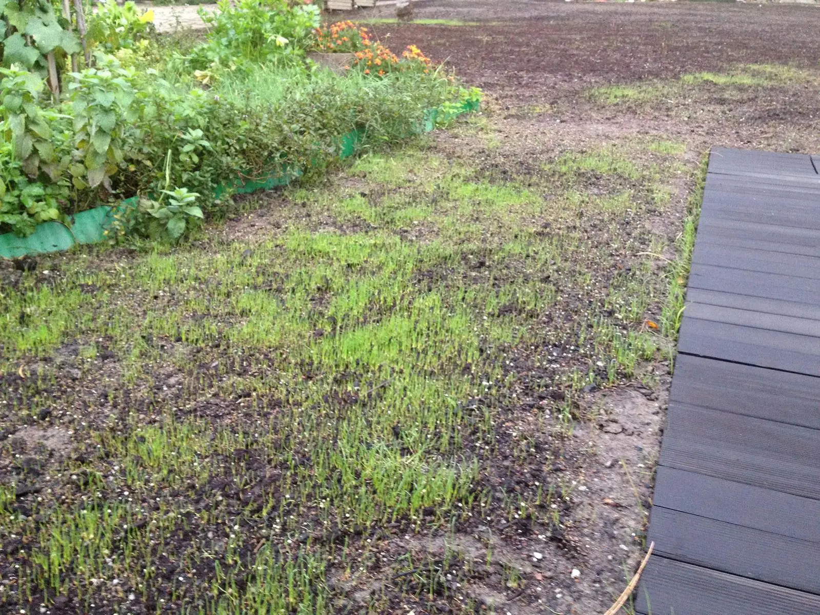 Vielleicht ist es auch nicht vernichtetes Gras aus dem alten Boden, aber auf jeden Fall auch Unkraut, denn es geht auch teilweise nicht einkeimblättrich auf. Aber vielleicht täusche ich mich auch und es spriest doch schon zart...