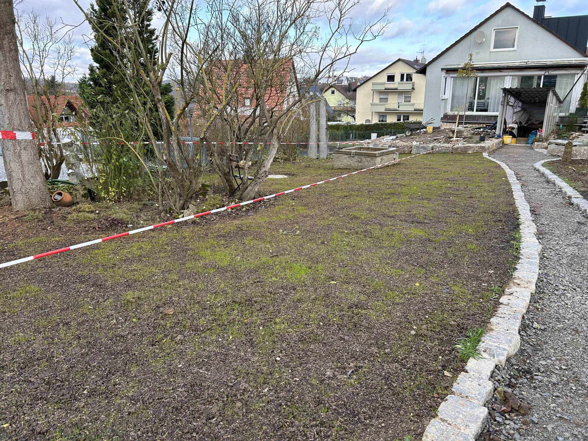 Es ist nicht mehr viel passiert, außer die Rasenansaat und er ist auch schon ein wenig gewachsen.