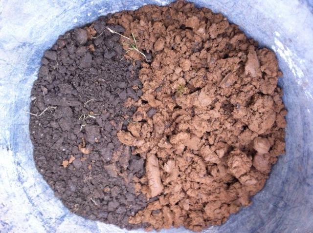 Auf dem vierten Bild ist das Ergebnis der Probebohrung zu sehen. Links der Mutterboden, der optisch einen guten Eindruck macht. Wenn man ihn aber zusammendrückt, merkt man einen leicht pappigen Effekt (Lehmanteil?). Rechts daneben ist der Lehm aus dem Bereich von 40cm bis 1,4m Tiefe.