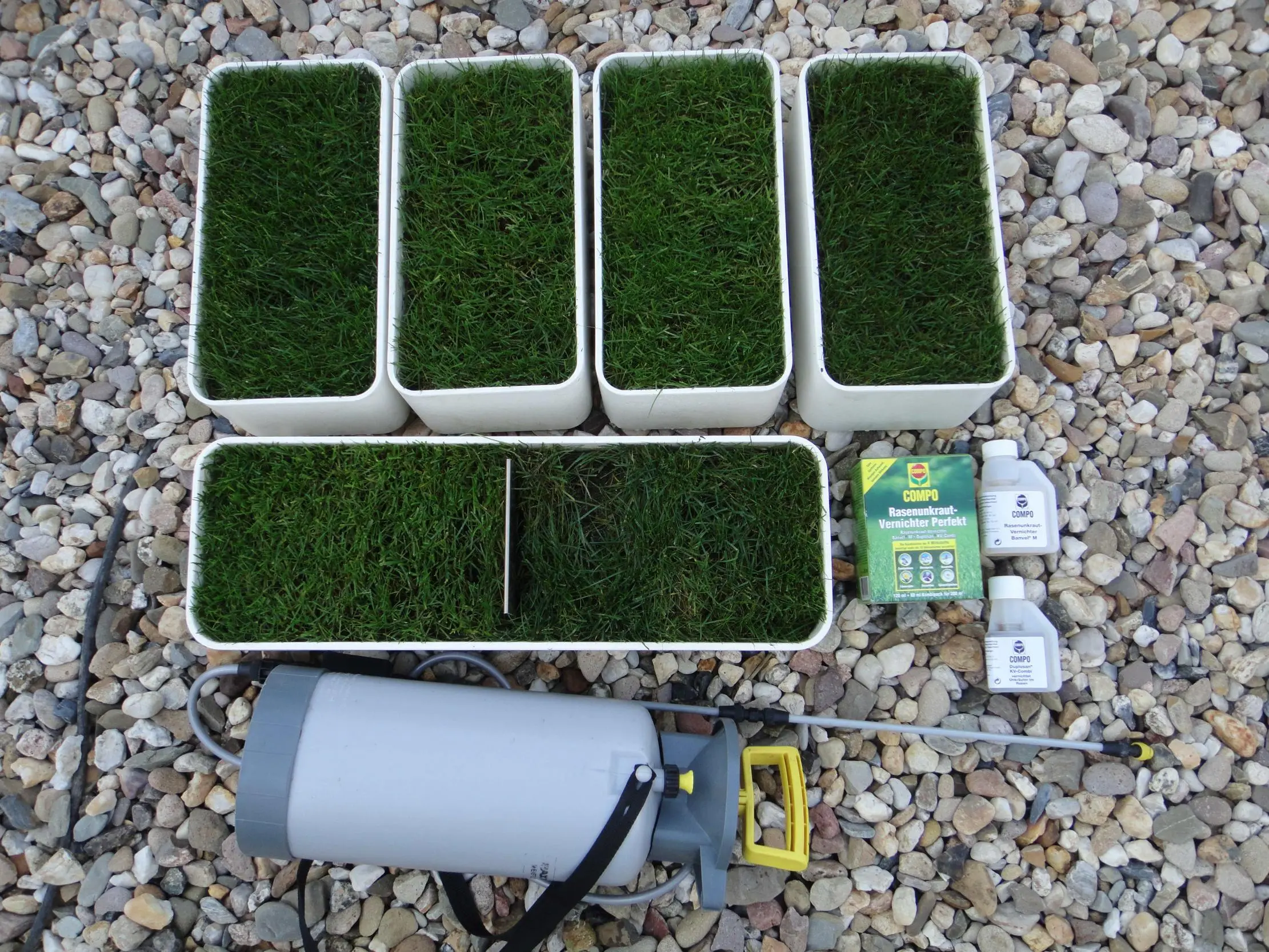 Für den Test wurde allen Behältern eine von Compo empfohlene Sprühung von „Unkrautvernichter Perfekt” verabreicht. Diese Lösung besteht aus den beiden Komponenten Banvel M zzgl. Duplosan.