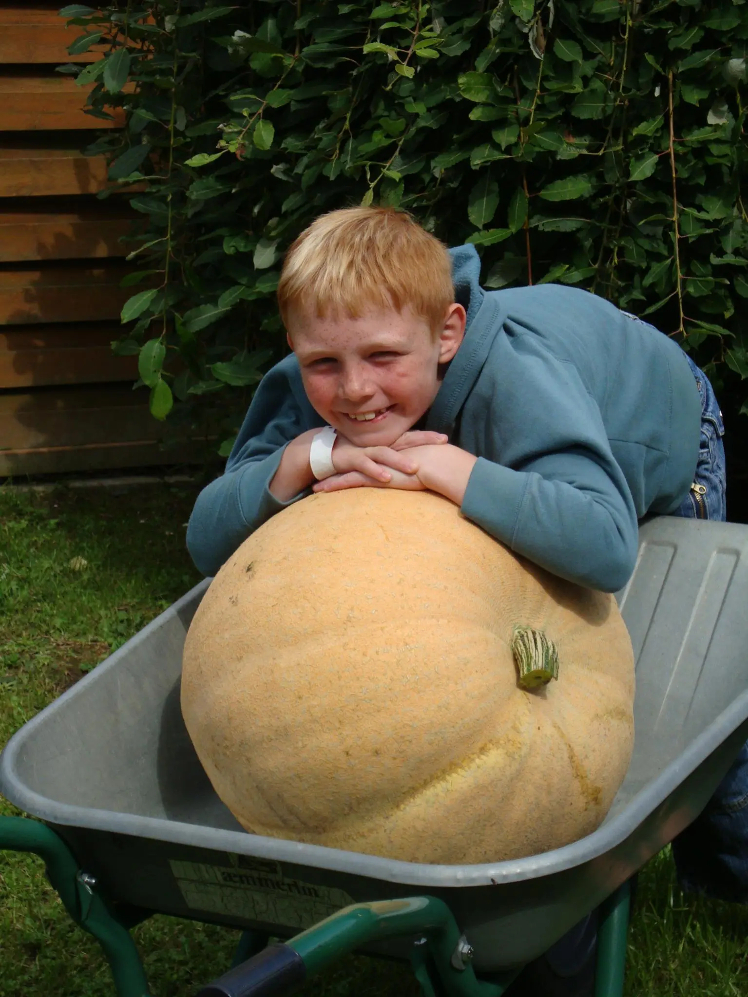 Hier ist der Kürbis mit seinen knapp 25 Kg. Für's erste Mal bin ich ganz schön stolz.:grins: Mein Sohn hat mal ein bischen mit ihm gekuschelt, damit man die Größe erkennt. :grins: