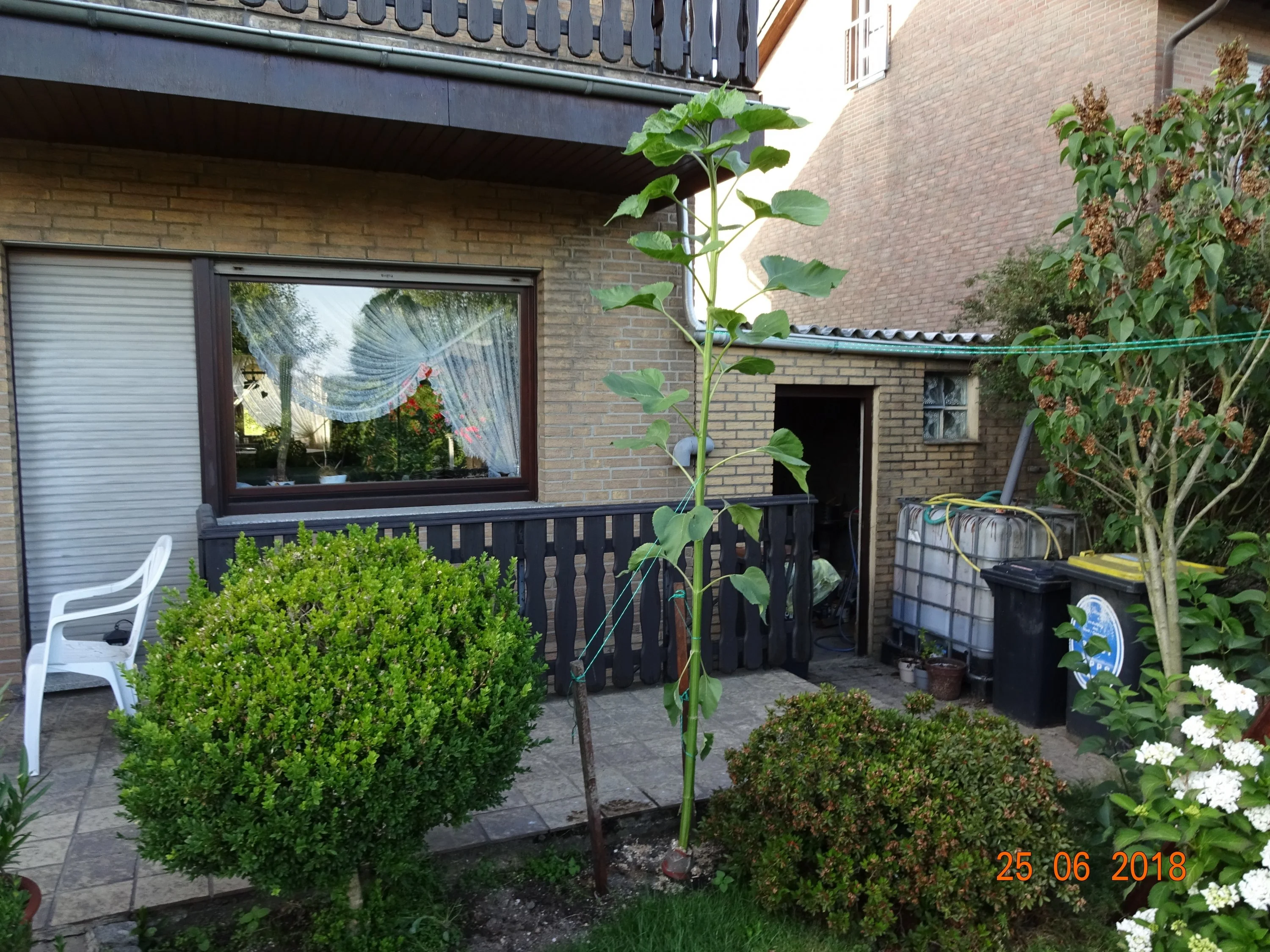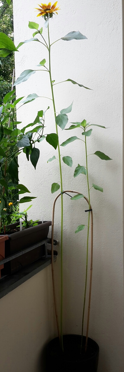 So, spät, aber nicht nie: Vier ausgesät, drei kamen, eine der drei ging kaputt, die restlichen zwei hatten scheinbar die Minierfliege in den Blättern, so dass ich sie lieber entfernte, weswegen die Pflanzen sehr zerrupft aussehen. Aber noch gebe ich nicht auf und kann noch einigermaßen mithalten mit 1,20 m bei der Kleineren und 1,80 m (T) bei der Größeren, sowie einer wunderschönen Blüte, wie ich finde. Ein weiterer Blütenansatz ist vorhanden, die kleine will nun wohl auch loslegen. Viel größer werden meine entsprechend wohl nicht werden. Aber für den Balkon reicht das ja auch. :- )