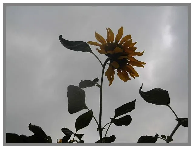 Ich war ein Wochenende im väterlichen Garten und konnte unser Riesenbaby noch mal vermessen, es hat sich ordentlich gestreckt und hat jetzt eine Länge von 3,70m. Ihr meßt doch auch dem Hauptstamm entlang, oder meßt ihr bei einer schräg hängenden Sonnenblume nur die absolute Höhe? Starker Wind hat an ihnen gezerrt, mein Vater hat inzwischen allen eine Stütze verpaßt. Sie stehen dadurch schräg, aber fallen nicht komplett um.