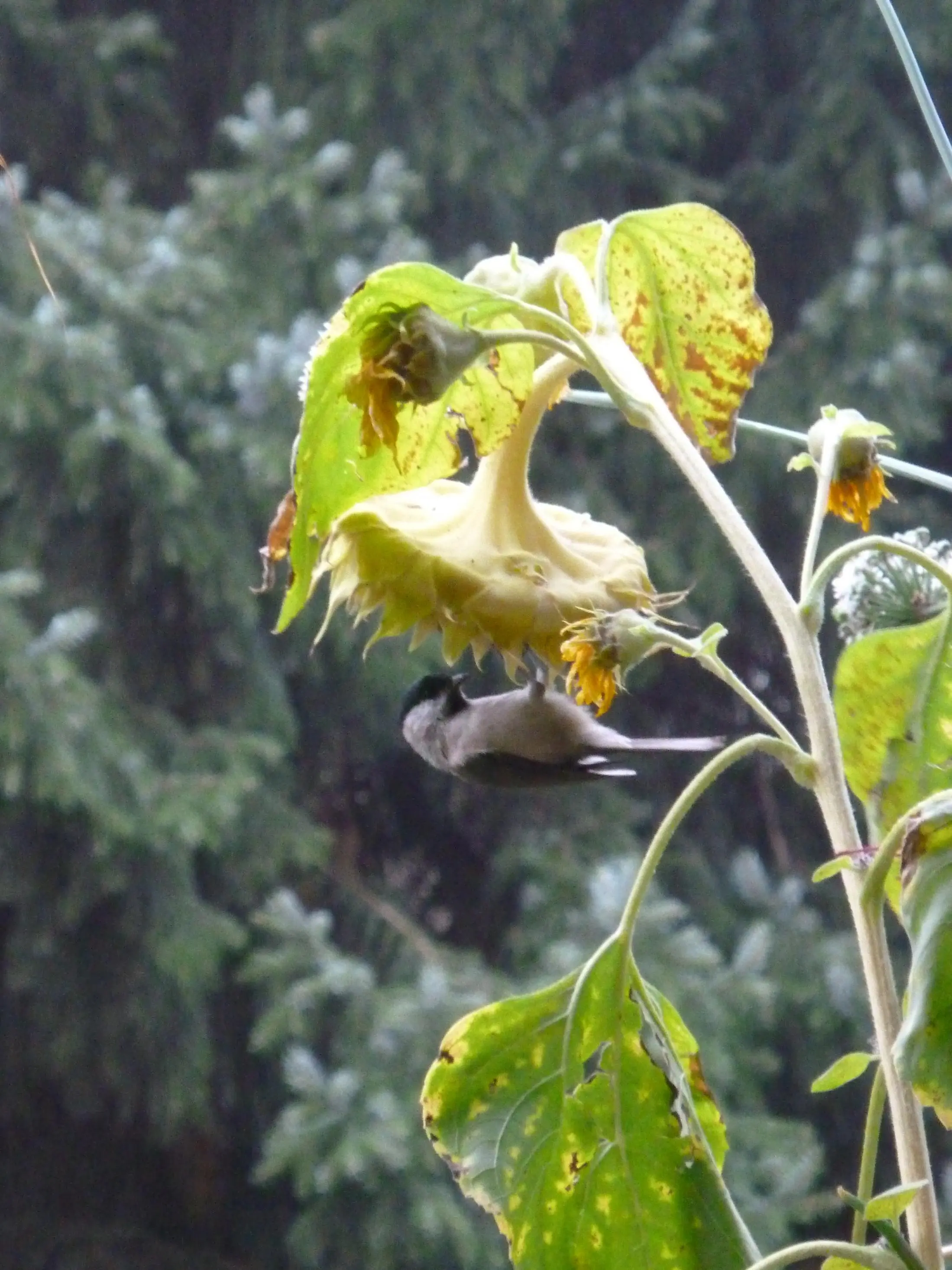 Meine kleine Balkonsonnenblume dient jetzt als Vogelfutter. Ich lasse sie stehen, bis sie leergepickt ist, so fressen wenigstens die Meisen die Samen und nicht das Eichhörnchen, das schon genug anderes findet.