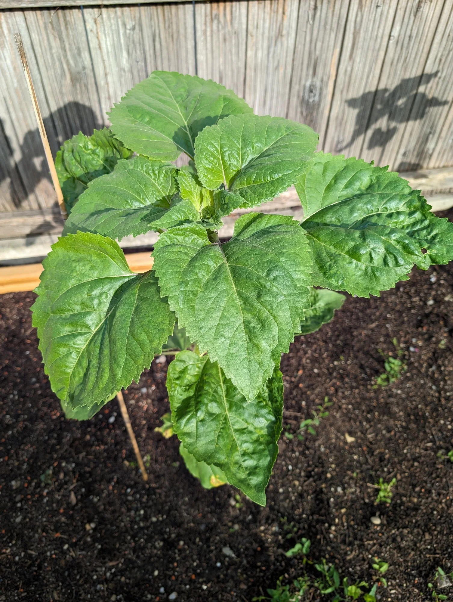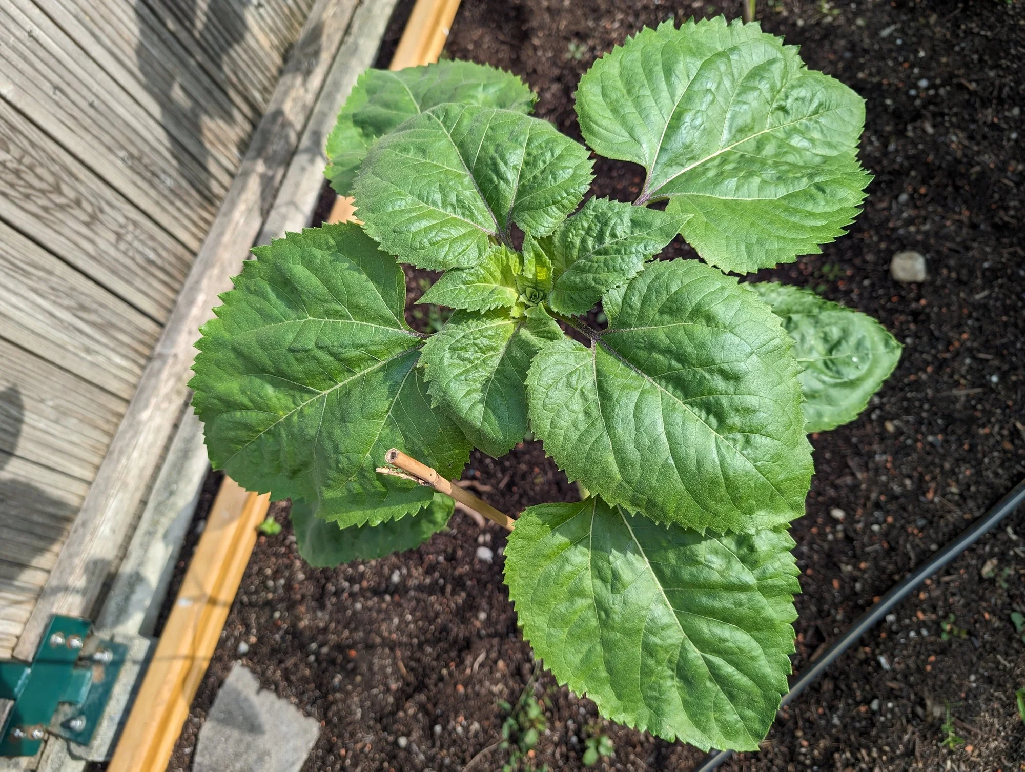 Lustigerweise habe ich im gemeinsamen Gemüsegarten im Elterngarten eine Sonnenblume gar nicht wahrgenommen. Sie ist zeitig von alleine aufgegangen und bereits 1,78 m hoch. Mehr als 2,5 - 2,8 Meter traue ich ihr nicht mehr zu, da der Blattkranz sich bereits Richtung Knospenbildung entwickelt.