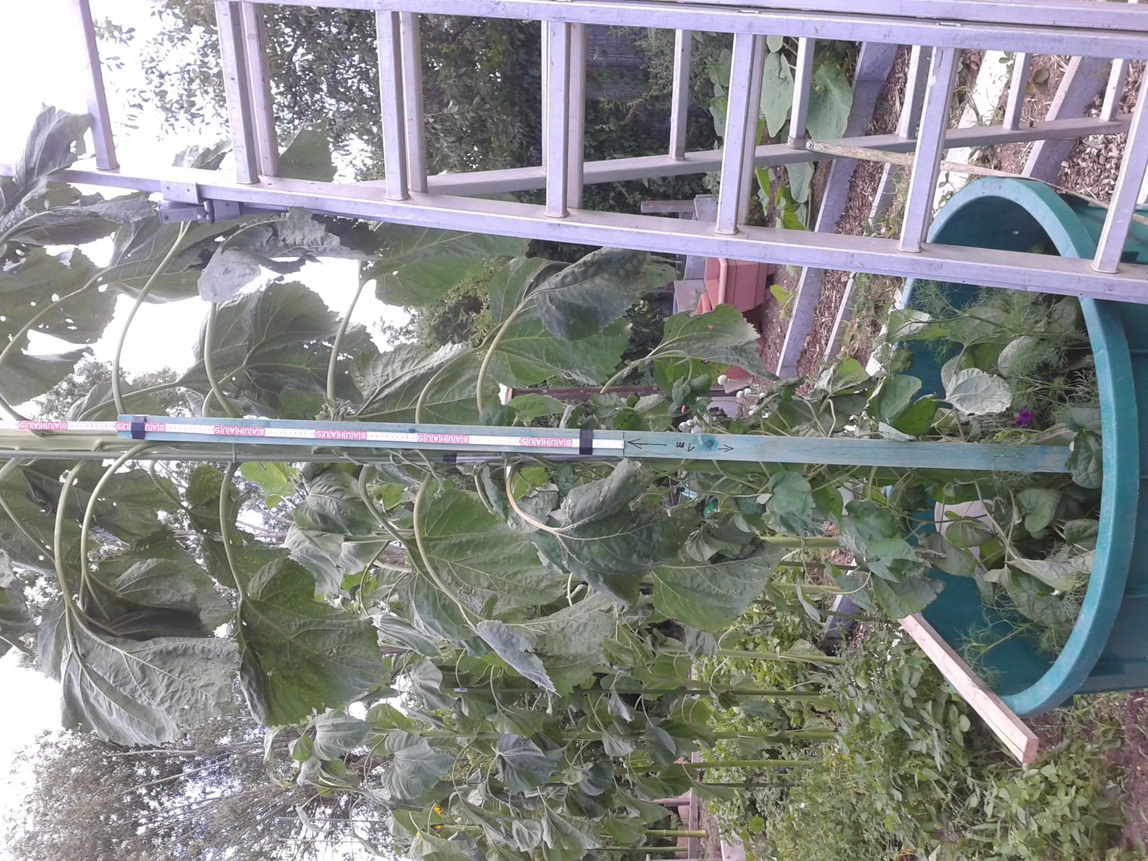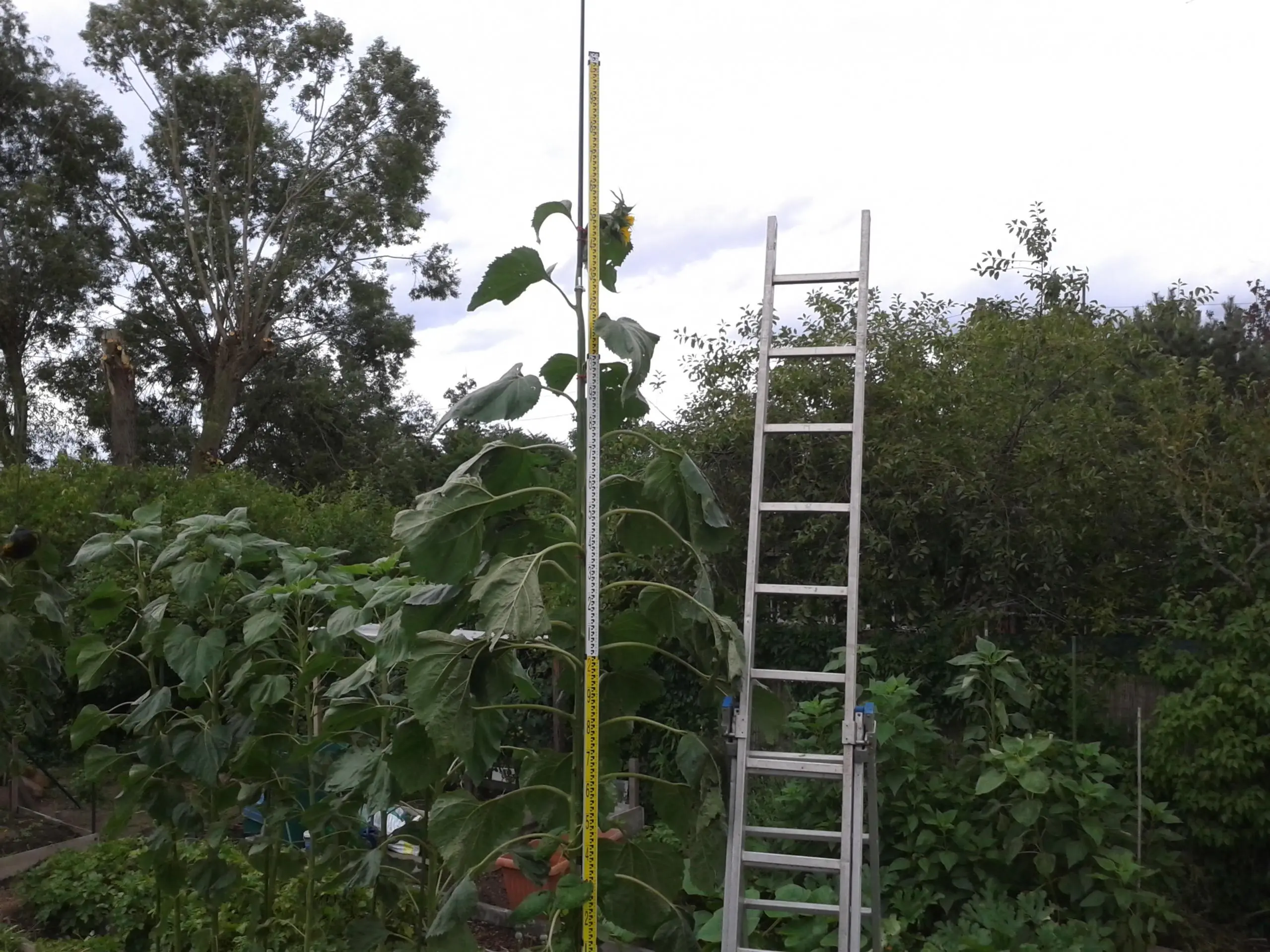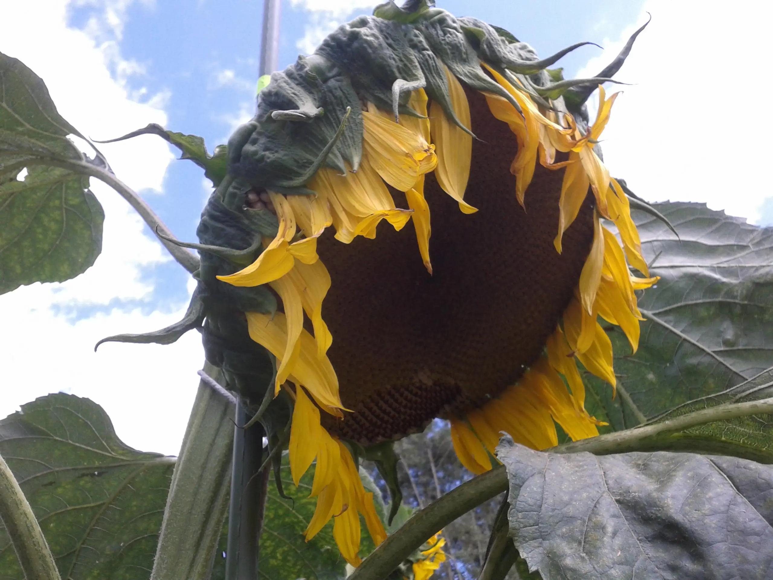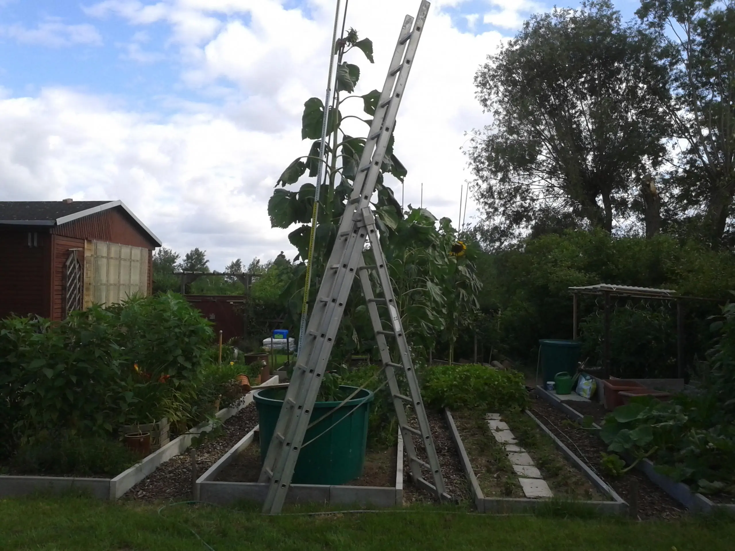 Eine meiner bereits großen Sonnenblumen wurde durch den Sturm in ca. 15 cm Höhe umgeknickt. Ich habe sie nun angebunden und hoffe, dass sie überlebt.
