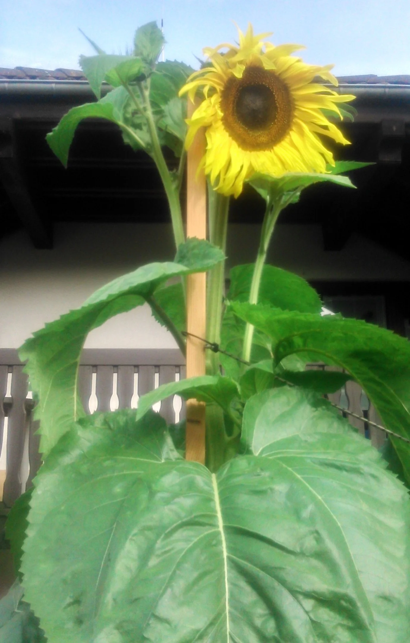 • Mir war schon zu Beginn klar, dass meine Sonnenblume auf demBalkon in zu kleinem Kübel nicht mithalten kann.