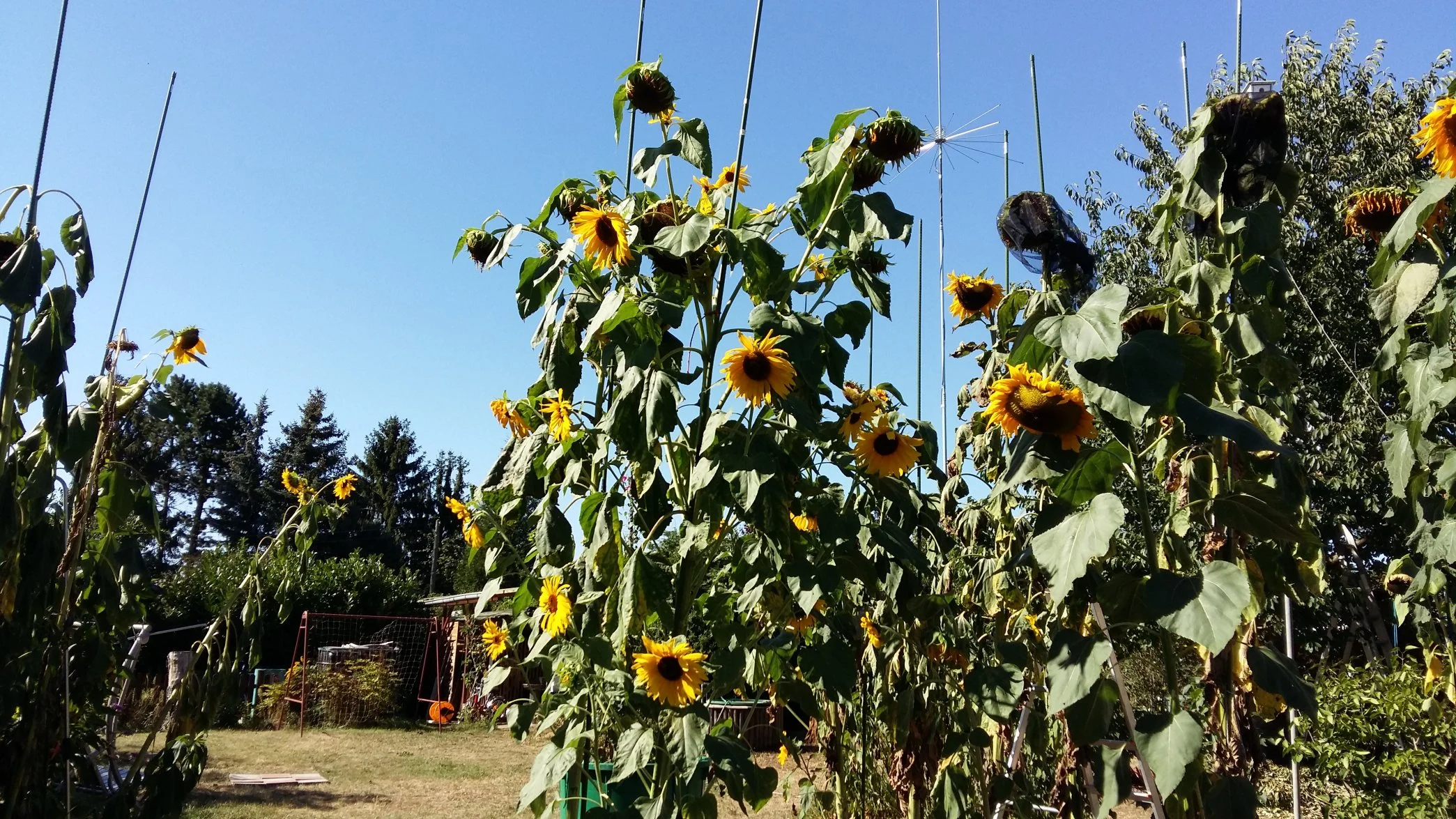 Wollte mich auch mal wieder melden. Einen Höhenrekord gibt es nicht zu vermelden. Einige von den wild gewachsenen Sonnenblumen habe unzählige Blüten und Triebe mit winzigen Knospen. Eine hat über 40 Blüten ! Wenn ich alle Triebe zàhle wir es es kompliziert. Ich setze mal ein Foto rein.