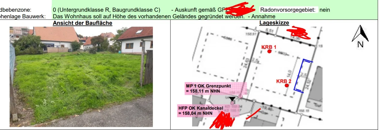 Der letzte, bunte Auszug in dem man ganz oben auch ein klein wenig unseres Grundstücks/ Lageplan sieht hat der Hausanbieter vor Verlegen der Bodenplatte anfertigen lassen. Alle anderen Auszüge stammen aus einem Gutachten, dass wir vor Hausplanung schon haben machen lassen. Weiß nicht ob das eine Rolle spielt.