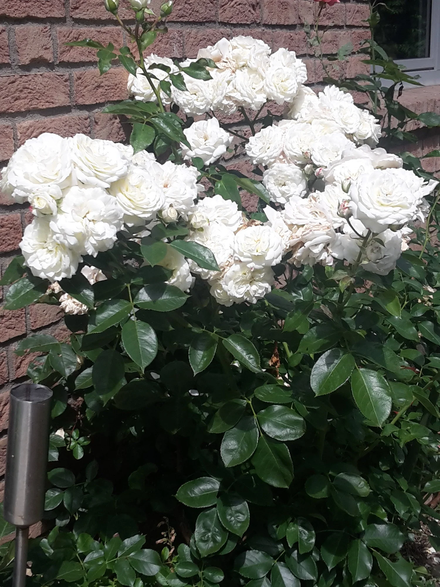 Die Rose habe ich seit 2015. Die habe ich zuhause am Schuppen auch noch. Ja, das war so gewollt, das sie zwischen den beiden schmiedeeisernen Gräbern steht. Das Nachbargrab war meine Lieblingsnachbar. Der ist gestorben, dann hat die Nachbarin das Grab neben unseren gekauft. Meine Eltern haben die Grabstäte noch zu Lebzeiten gekauft. Dann starben meine Eltern und danach der Lieblingsnachbar. Ich sah dann mal eine schöne Kletterrose zwischen zwei Kreuzen. Das hat mir so gefallen. Habe das meiner Lieblingsnachbarin (Reservemutter habe ich immer gesagt) . Da haben wir vereinbart, das ich so eine Kletterrose kaufe, sie wollte sie bezahlen. Wollte die Rose im Frühling kaufen. Im Winter ist sie dann leider verstorben und die Rose nicht mehr gesehen. Sie würde sich so freuen drüber und meine Eltern waren auch so Rosenfans, die würden sich auch freuen.