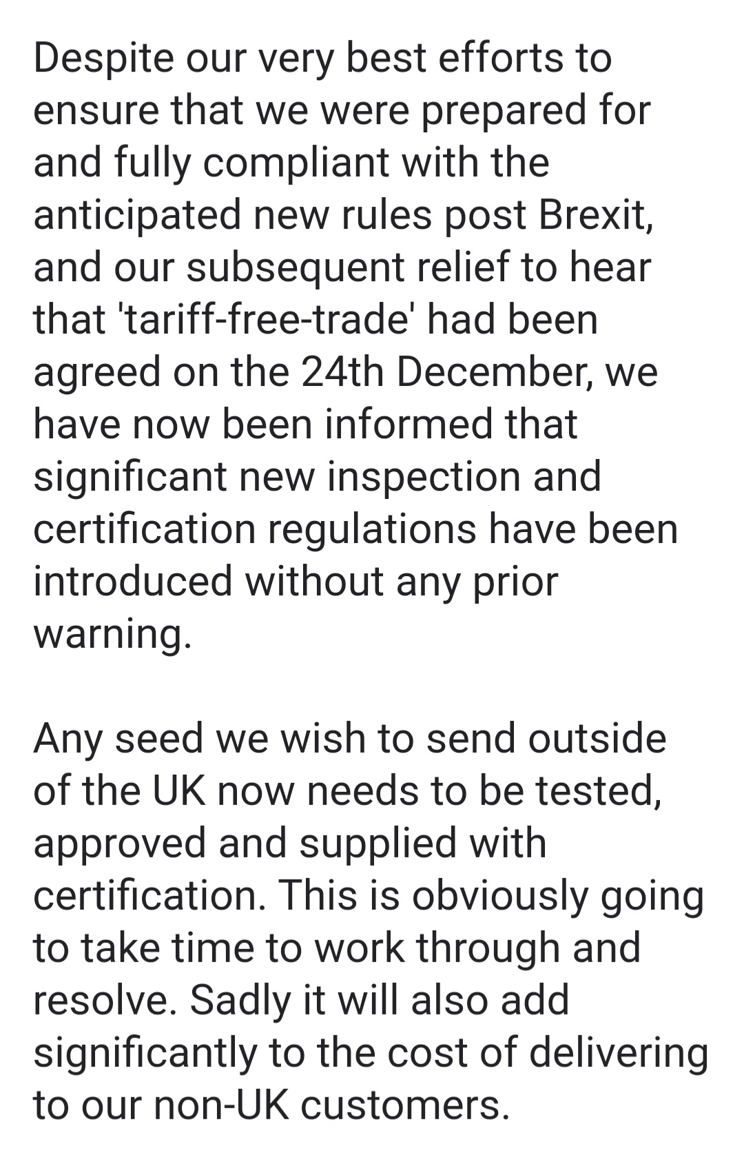 Die Crux für die Saatgutanbieter in UK sind doch die Kosten für die nunmehr geforderten Zertifikate und Pflanzengesundheitszeugnisse für jede Partie einer Art/Sorte von Saatgut.